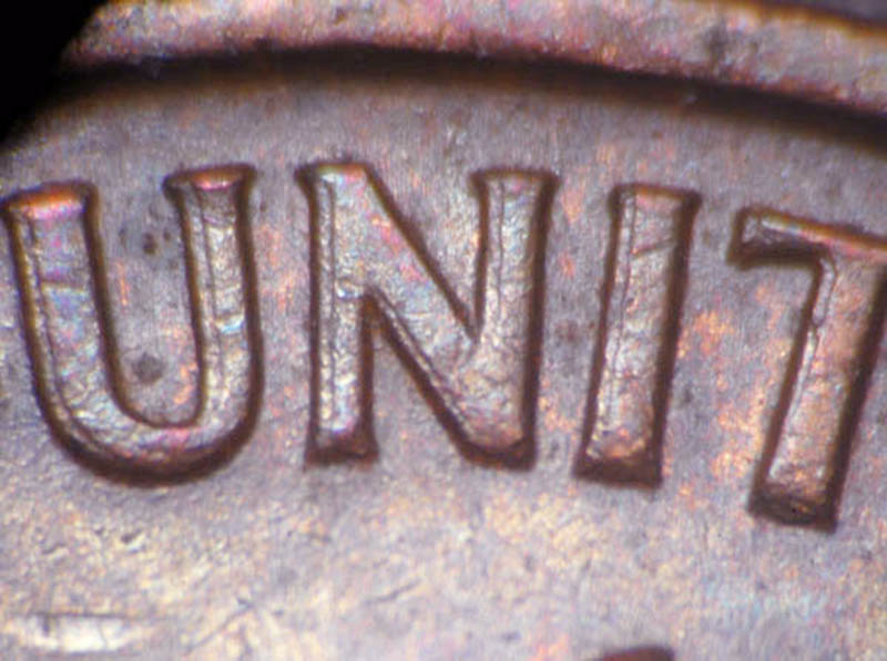 I also rely on the additional thickness, best noted in the left side of the U (although present on other letters) in conjunction with the split of the T that tells me the coin displays evidence of an additional hubbing.