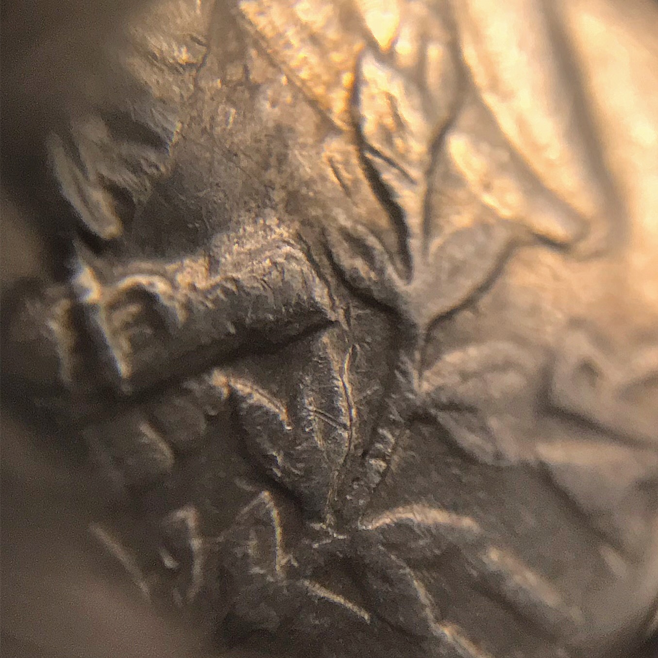 Specifically look at underneath the wings, the thickness of the letters on the reverse, and the leaves of the wreath. All that looks way off and doubled to me