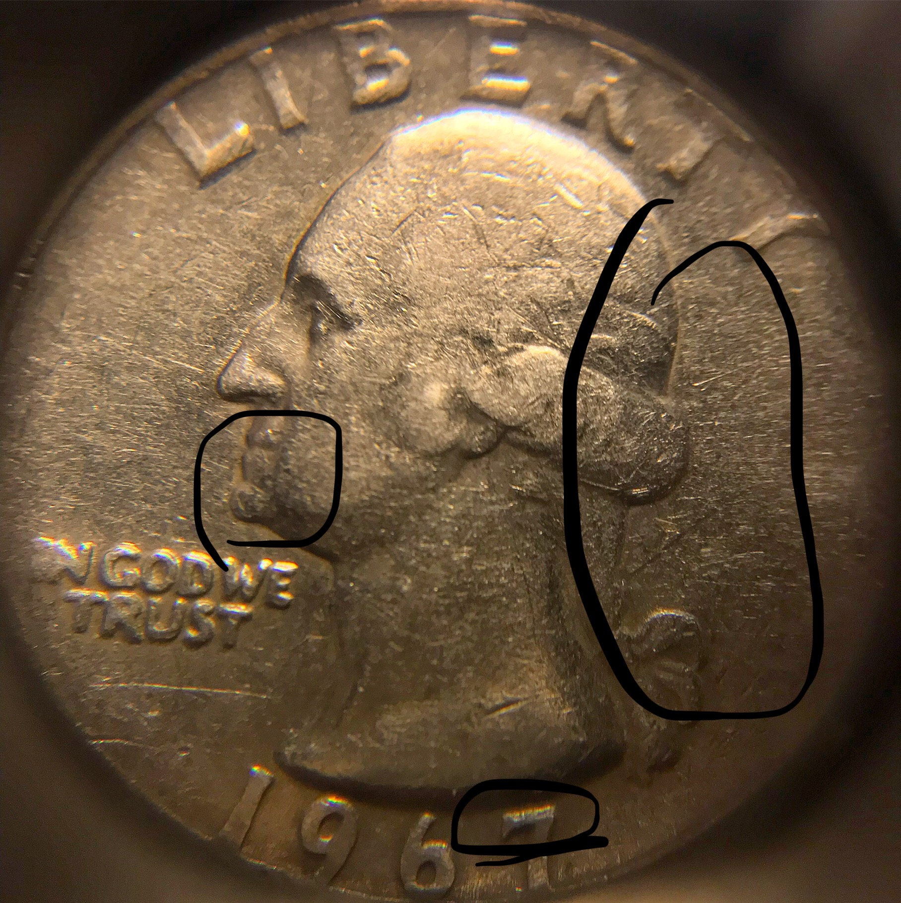 Check out these 1967 Quarters on Wexler's site. The doubling is very easy to see in his photos. http://www.doubleddie.com/1967437.html The split serifs can clearly be seen.