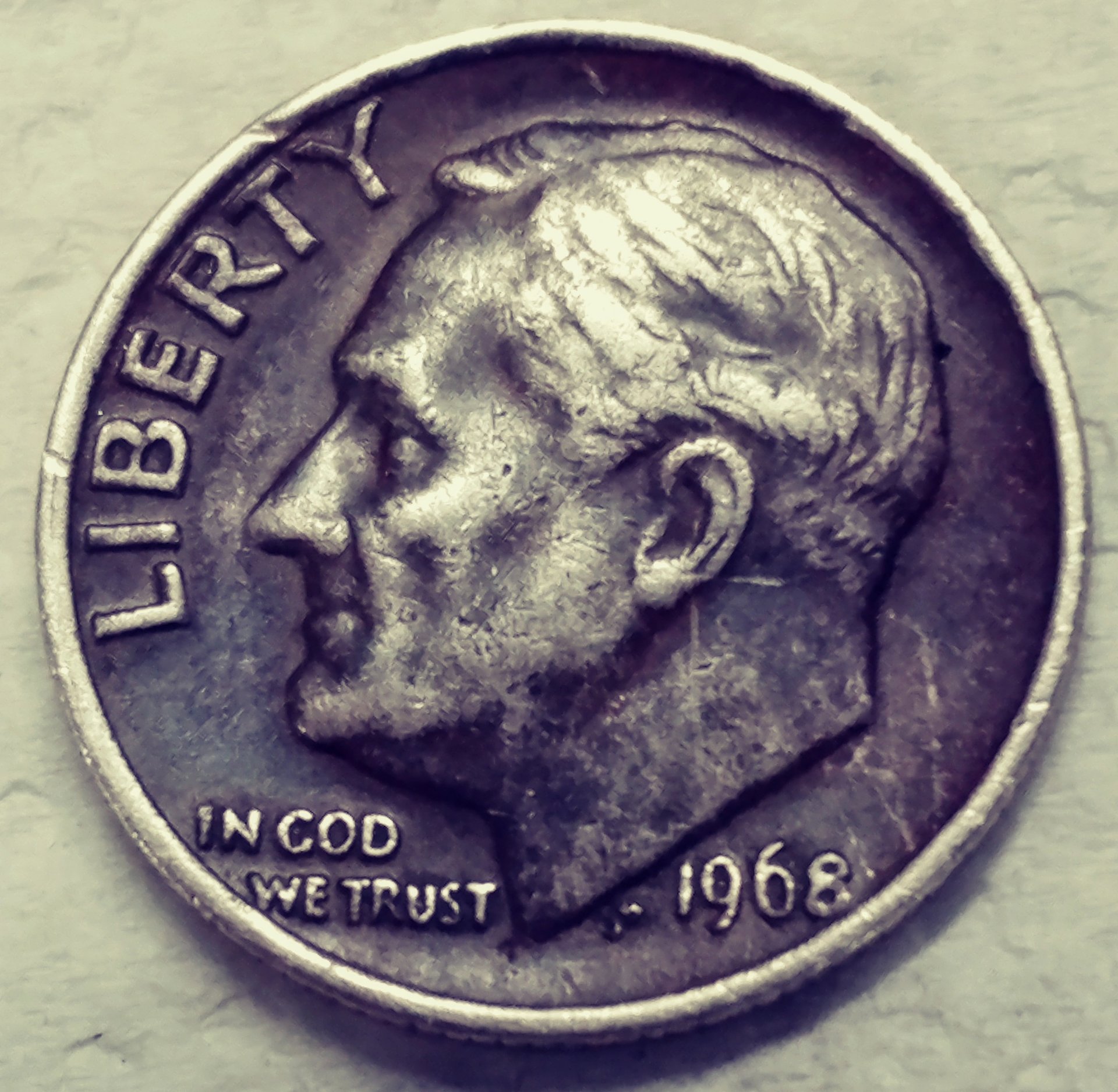 Value is easy... 10 cents. Many things can cause that kind of discoloration, but it does not add value. Your dime is just a normal 1968 Philadelphia dime, not a proof. Keep searching and you will find something good!