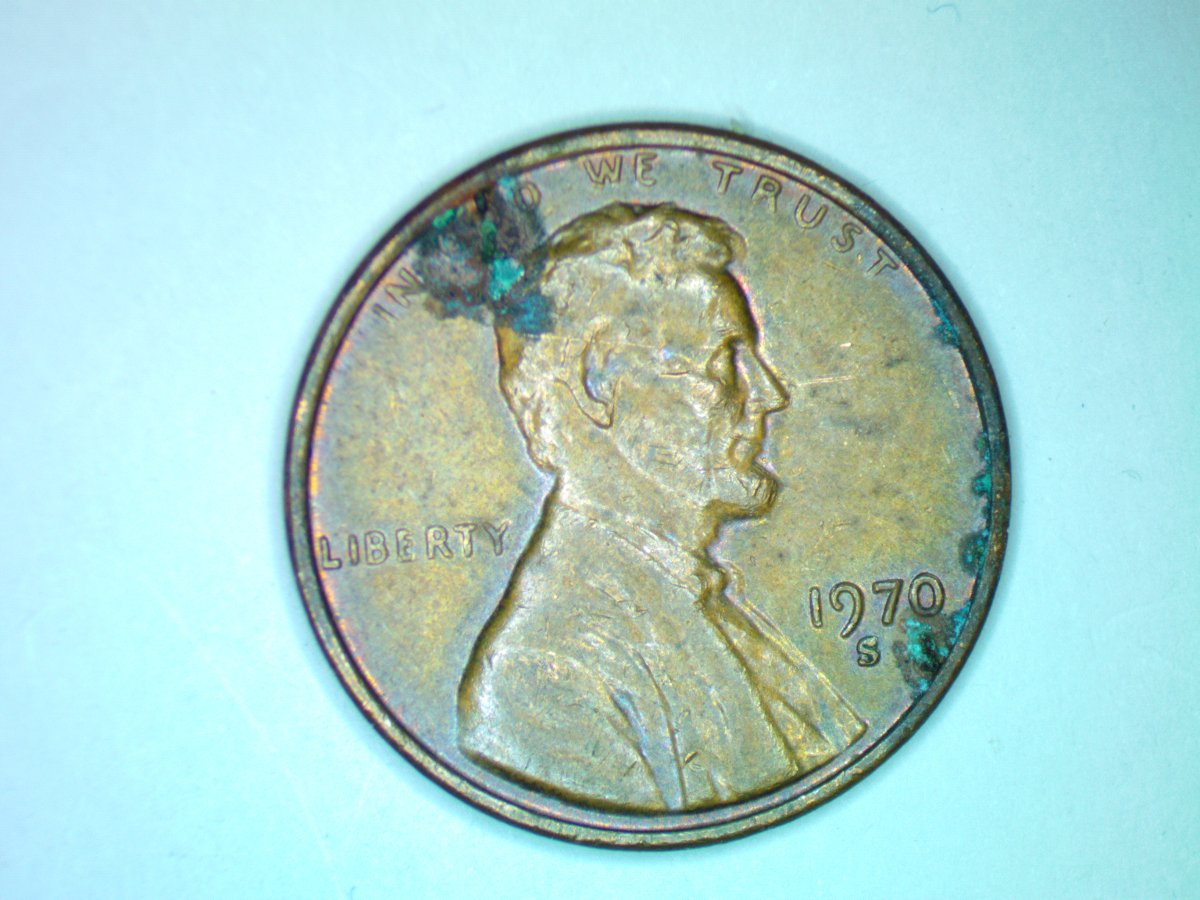 ...Air causing oxidation of the copper molecules at the surface of the copper coin. Environmental damage, corrosion from chemical contamination, excessive heat...there’s a lot for copper to react to...Spark
