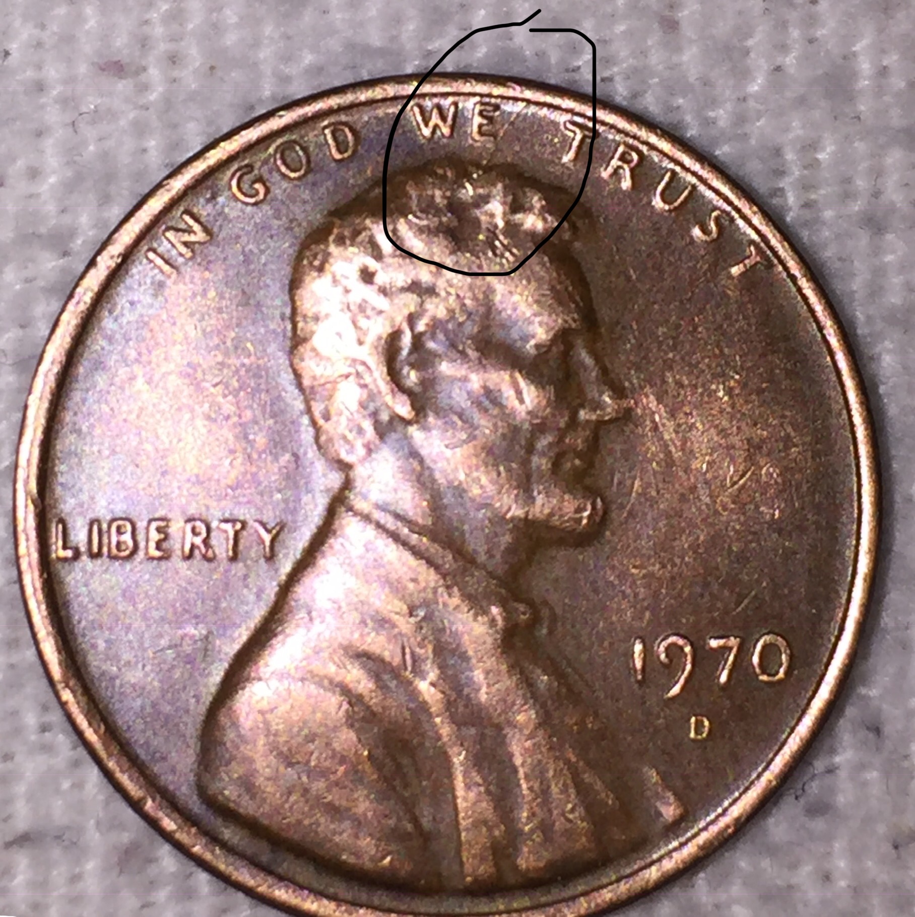 Hi Mary, based on your photo I'm pretty sure its a die crack from the rim into Lincoln's head. People collect these and refer to them as "spiked head" coins. They can be fun to collect but unfortunately don't really command much of a premium. Here is a link you can check out to learn more: http://cuds-on-coins.com/lincoln-cent-spike-heads-1970-1979/