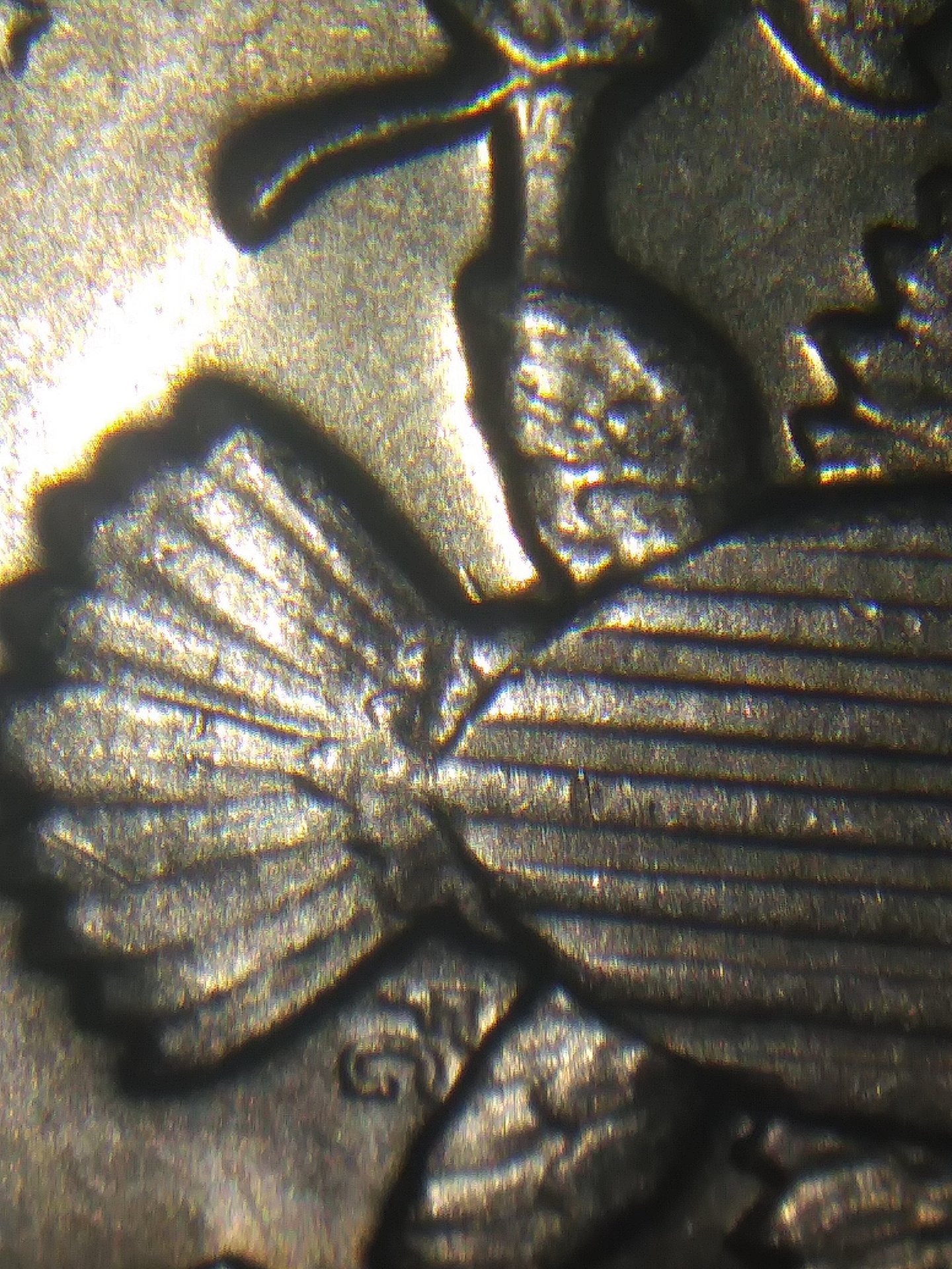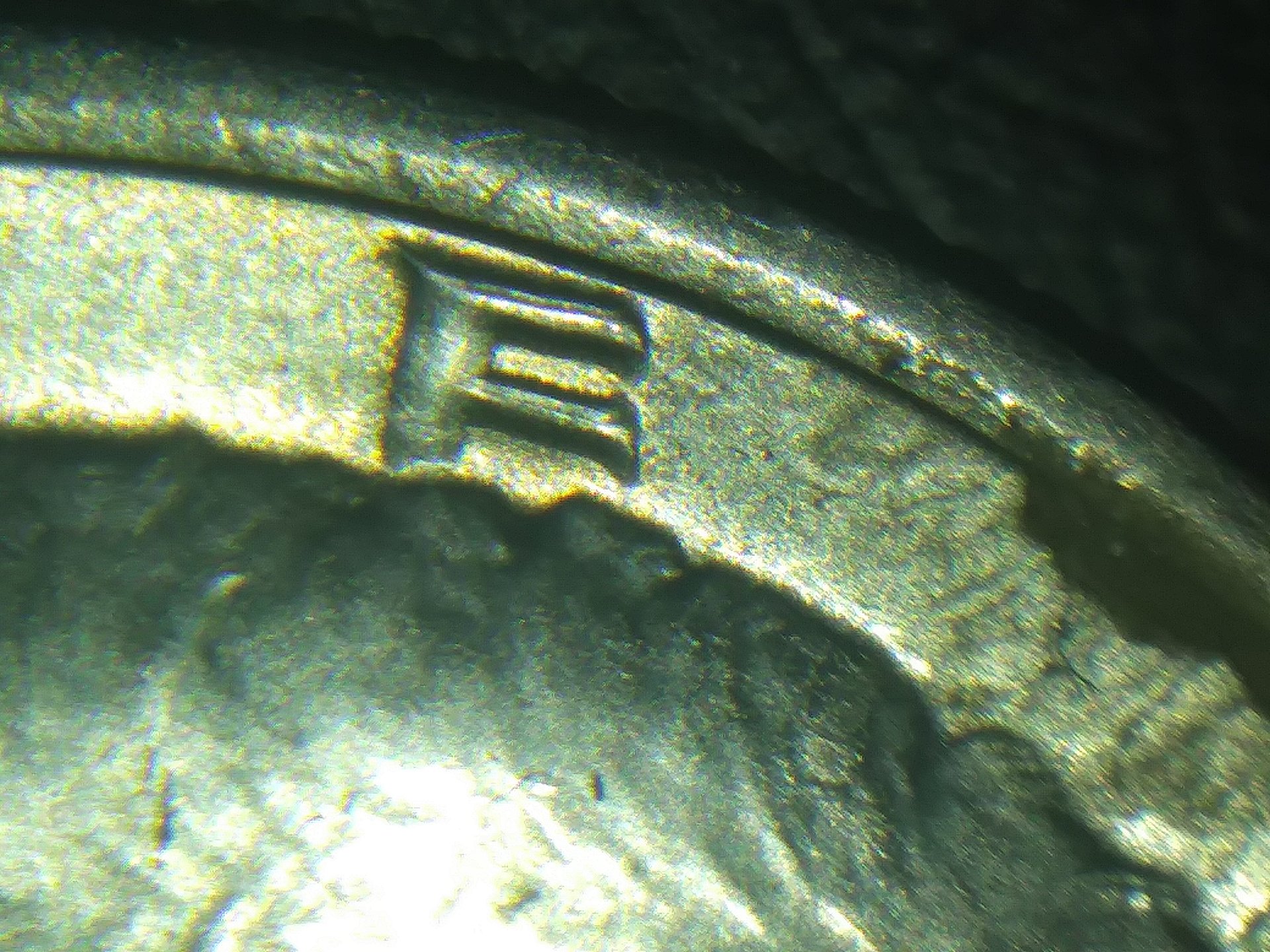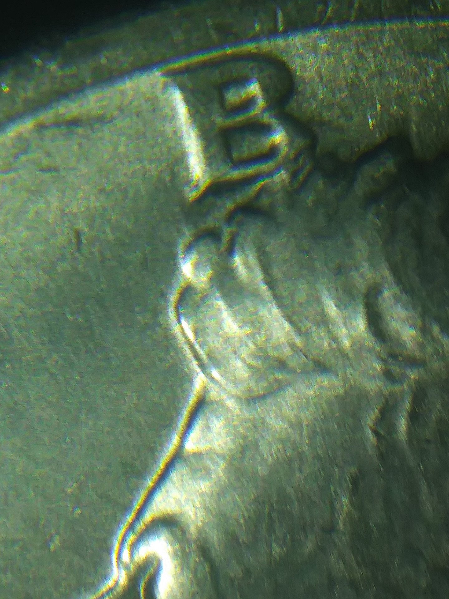 So this is what I have. Pics are for Slipperysocks mostly. Thanks again to everyone whos been helpful with my questions. I REALLY appreciate it!!! 1st, the die marker. REV under inner RH eagles leg. Little dash. 2nd. Split in the LH tip of R 3rd. Doubling of the E 4th Bottom LH tip of B shows split. Again, not microscope pics but the best I can do. These are the most abvious points that jump out to me on this coin. They are out there!!!