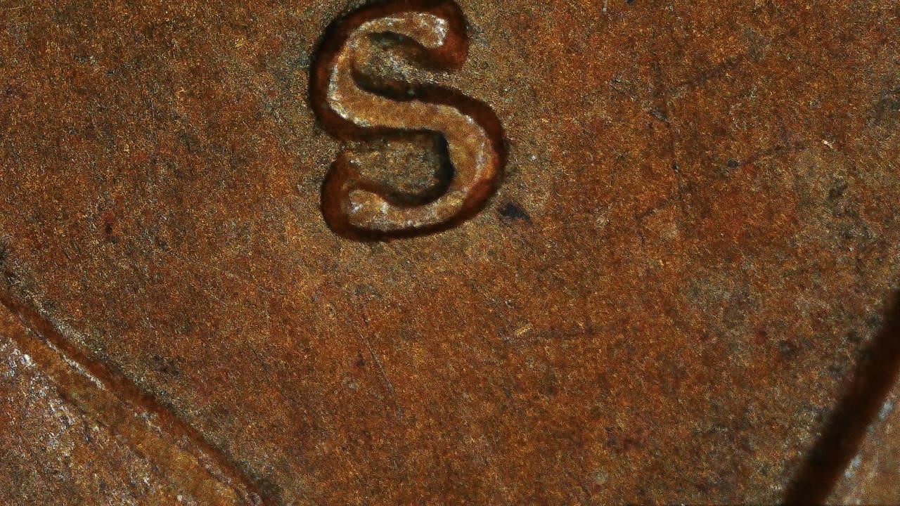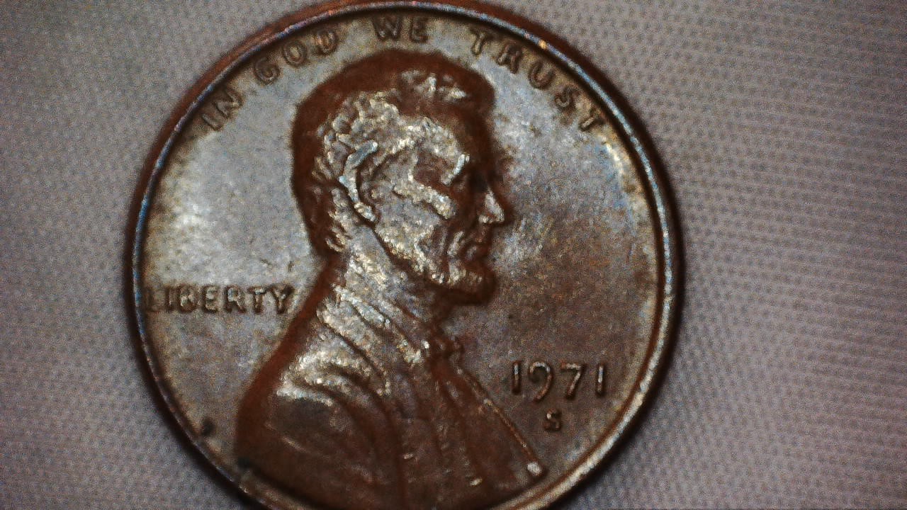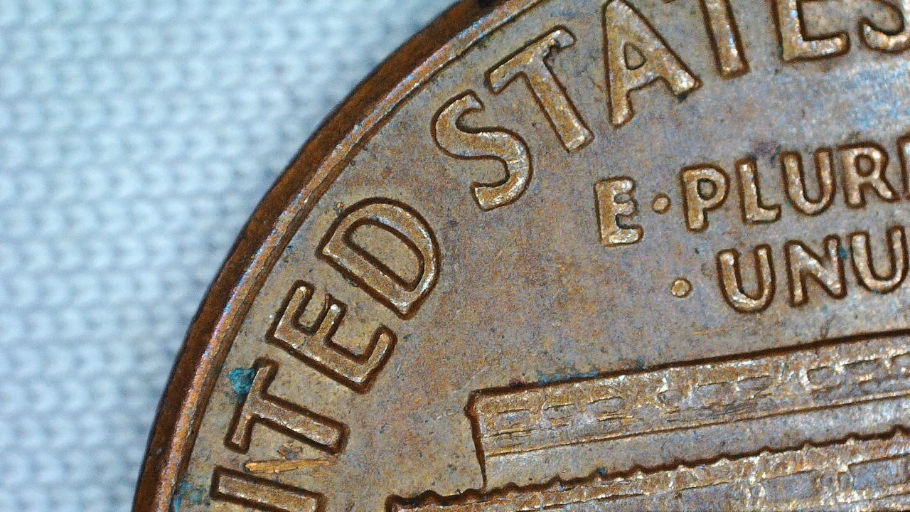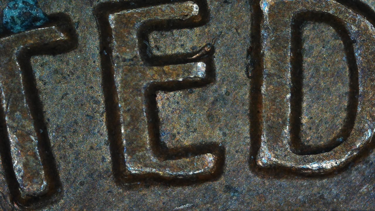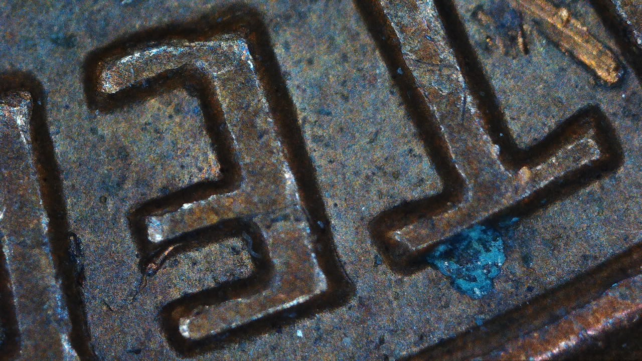 Looks like the bottom of the E took a small hit so it now appears curved and the middle line in the E is s small die chip.