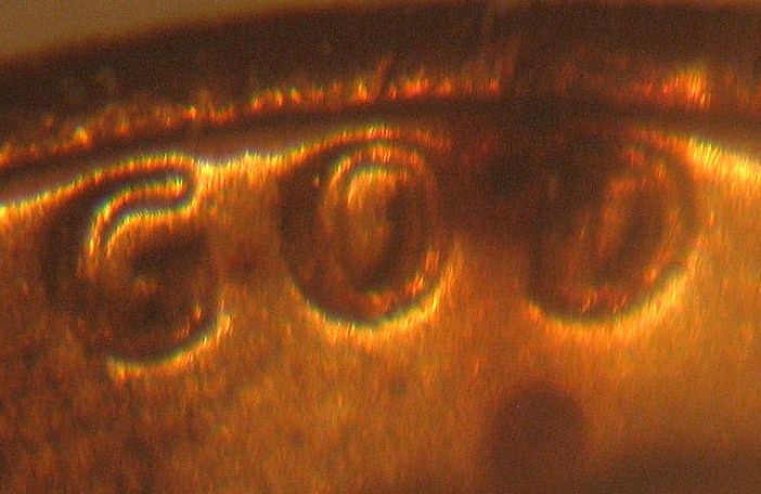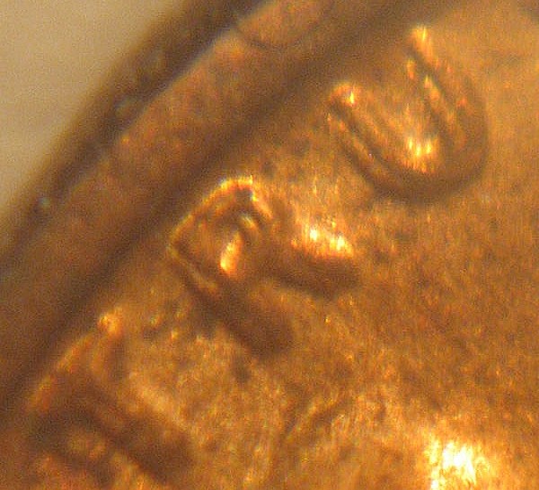Not sure what you mean by "right by". Look at the double crossbar at the top of the T, and on the left side there is a die gouge which would produce a raised area right near the intersection between the top doubled crossbar and the lower doubled crossbar., on the letter "T" itself. The photo is hazy at that point of focus, bu you should see with a loupe. It does have some appearance of such, but it needs to be sharper to be sure. No, #2 spread is counterclockwise, whereas the above and #8 are clockwise. Look at the "U" in "TRUST".