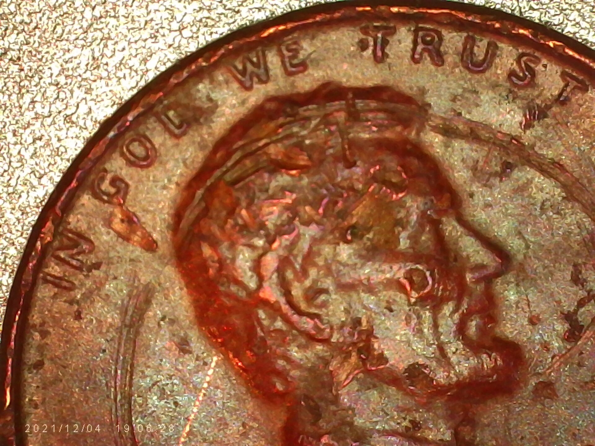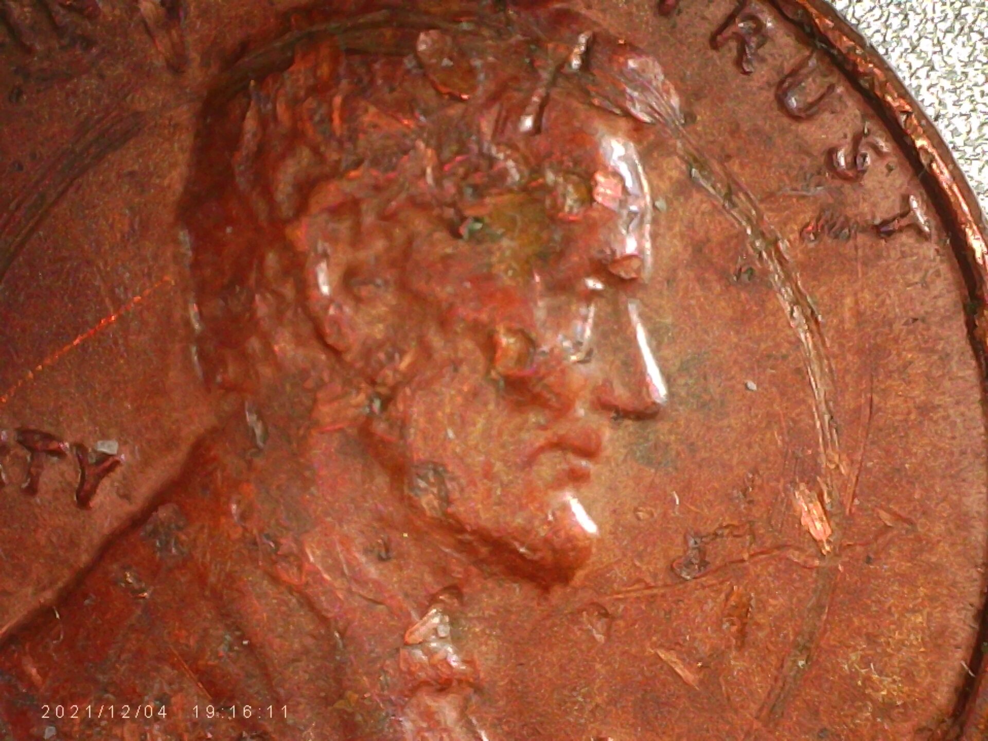 I am not an expert in this area, but my comments are based on my logic. This coin has too many mint errors; D on the cheek, forehead, and.... you tell pls. The circle does not seem to be a candy coin circle. The color is matte chocolate red and the weight is 3.07 grams. What do you think, please?