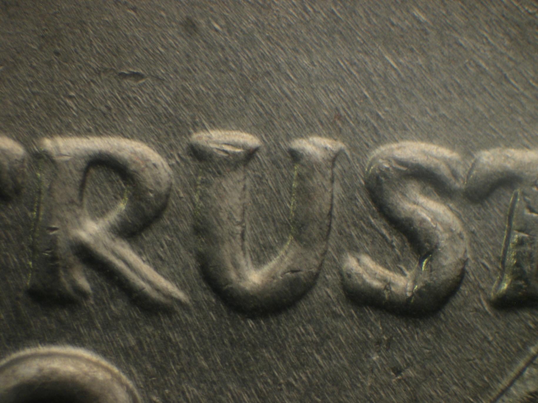 Not the same Larry but that's a super photo,i am going to come from a different angle with shots.I am going to post three photos,the first will be a close up shot of WE TRUST if you will look to the right of the S and the T there is a secondary S AND T.The IN GOD shot notice the left edge and secondary D inside.The last photo notice the left side of R and secondary letter inside.