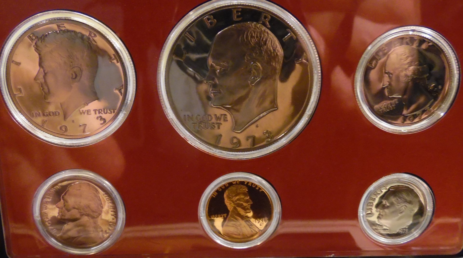 I have this '73 proof set and the Kennedy is a DDO-002, the Ike is a DDR-004, and the nickel although undocumented for any varieties, has doubling of the forehead and eye. While I'm very confident on the half and dollar, there is some question if the nickel is MD or DDO? I have not set them free and tried to take some pics through the plastic, but there was too much glare and none of them show what the eye can see. My question is which makes more sense? Keep them encased as is or bust them out and get them properly attributed and possibly graded? In regard to which case scenario is chosen, which has better value in the long run? Also, is it common or not to find multiple errors/varieties in a proof set vs. a mint set? You can see some of the details on the Ike, but the Kennedy not so much and no luck whatsoever on the nickel.