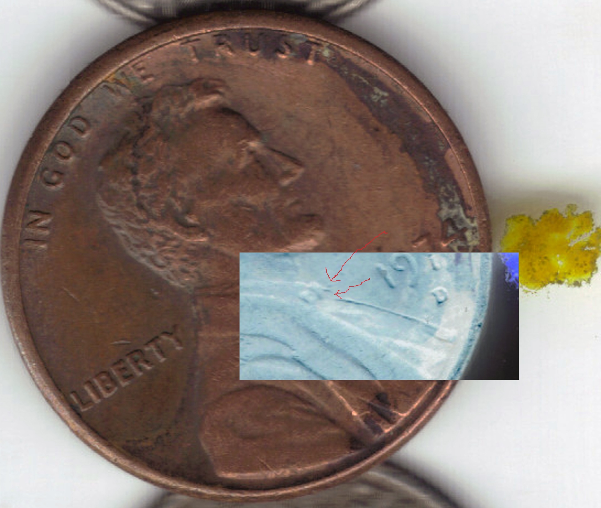 the part at the bowtie looks to have been where some of the design from the die has been removed because of over polishing the die. is there something wrong with the top of Lincoln's head , in the photo it looks like something is wrong.