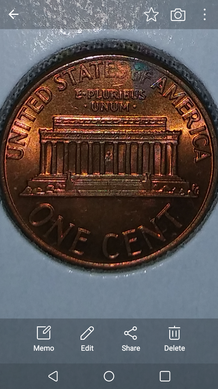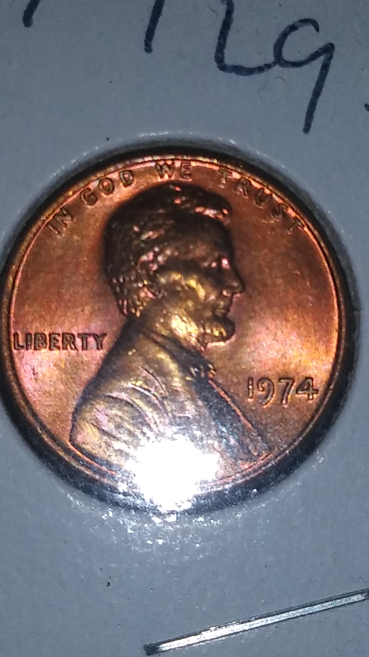 There is indeed a bit of color there, and nice luster, but the green spot is unfortunately some cause for concern. You could try acetone, but I'm not sure if that would do any good. For an easy and harmless fix with readily available materials, you could work on the spot with a toothpick or bamboo skewer - some kind of pointed wooden tool that's made of a material hard enough to work at the crud without being hard enough to scratch the coin (as a metal tool would). I would use some mineral oil or Vaseline, too, then wipe the coin clean with a paper towel or soft cloth, but not hard enough to polish it and disturb the original color of the toning. It isn't worth very much money, of course, so it's a low-risk coin to play with. Funny, it just so happens I found an original Red BU 1974 cent in my pocket change this morning. Never thought I'd see the day when a Memorial cent would be worth saving from change, but hey, these are 44 years old now, so finding them in UNC is fun.