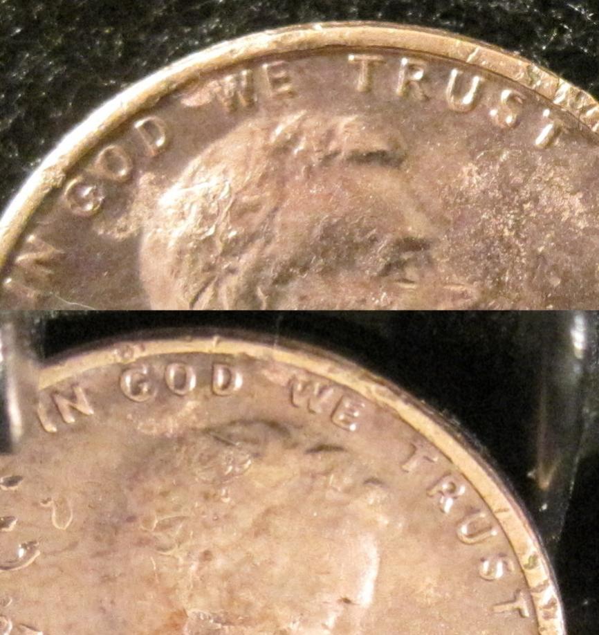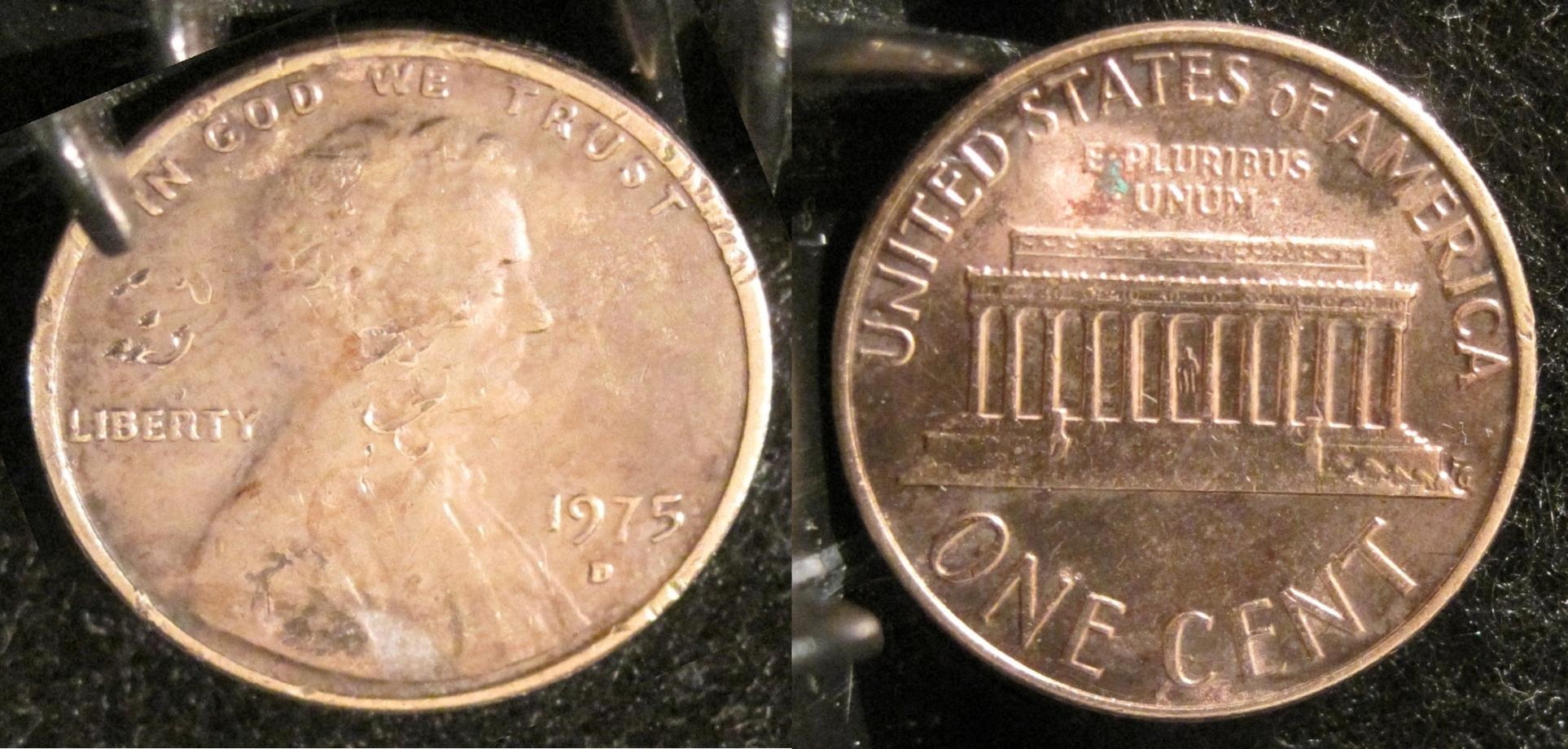 I cannot find any information about a 1975 D penny with doubling on the obverse. Even though this penny has had a trip through a garbage disposal (or something), I am seeing doubling all over the obverse. The mint mark seems to match up with coppercoins (004). I am interested as to whether you are all seeing the doubling on the obv. also. I didn't draw lots of arrows, because it is all over. Please let me know what you think.