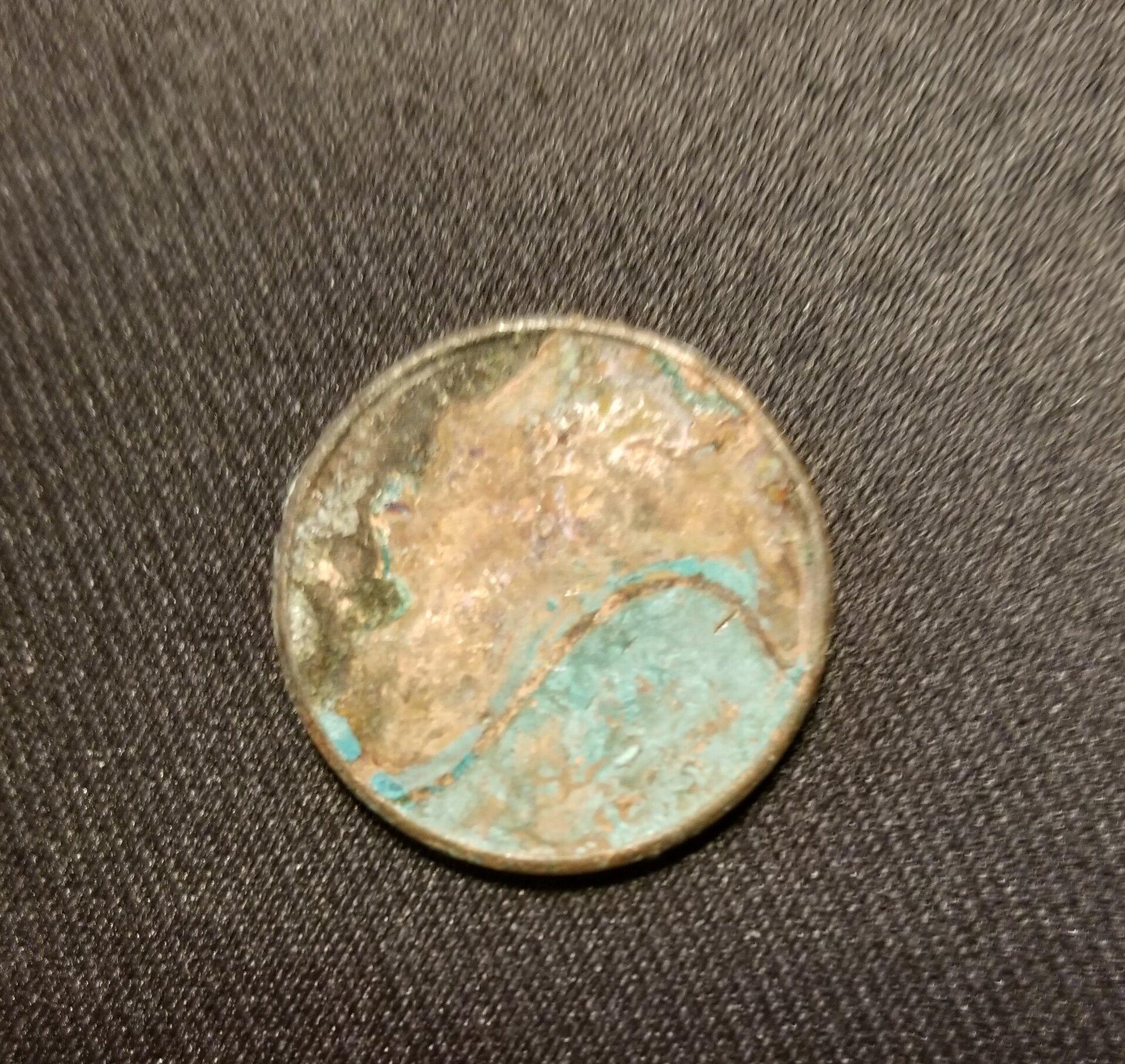 Just damage, most likely from sitting in a fountain or water. Drop it one of those "need a penny" jars at a store.