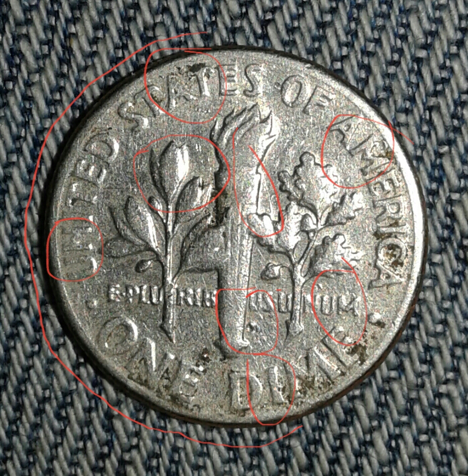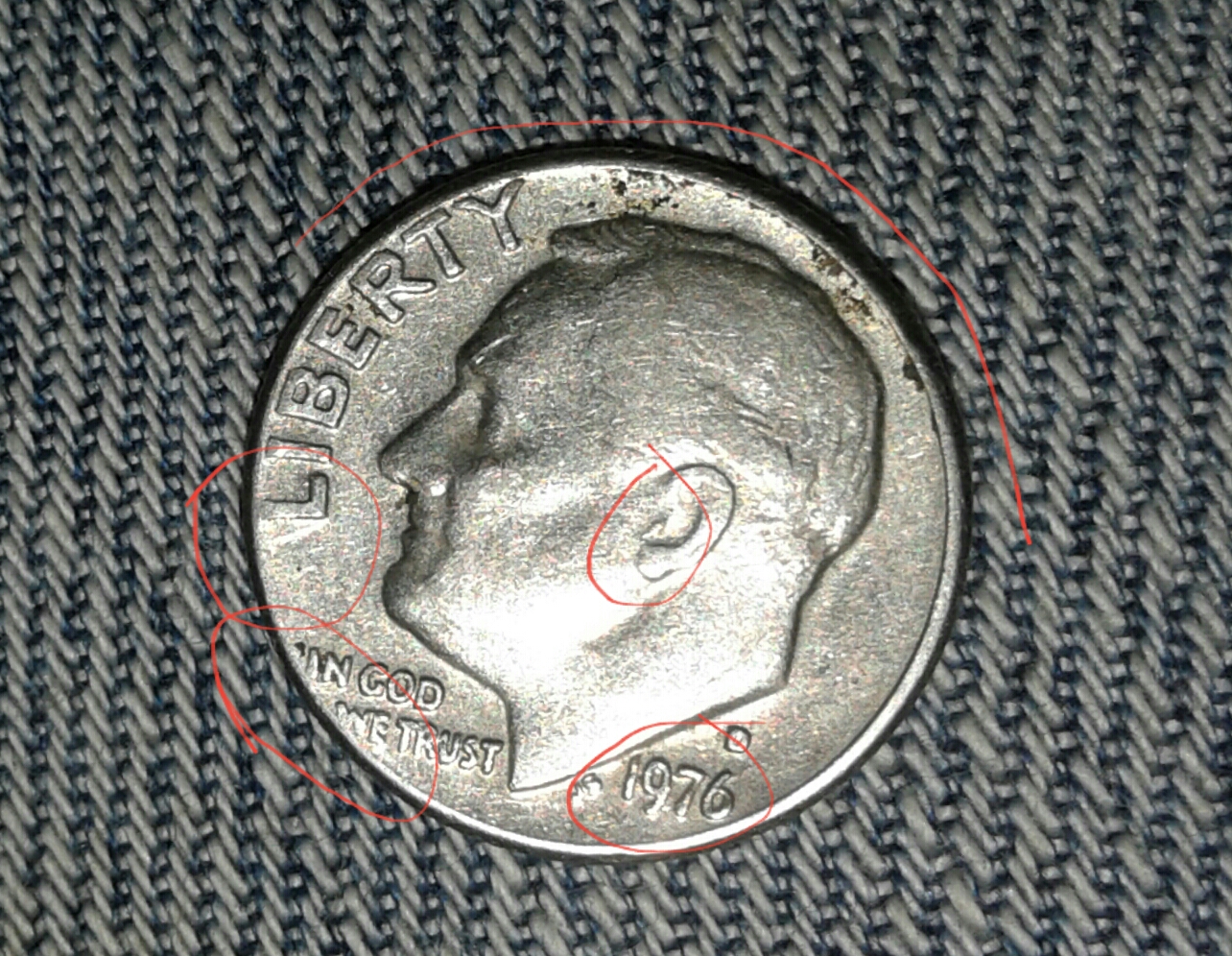 I didn't just mark it, forgot. But the E on LIBERTY. The two top arms? Looks like another arm of te E coming it in between them. Sorry, but the pics really don't show but most of the marks with just a magnifying glass? Not displace material. So gouged I don't believe caused it. But. That's why I'm asking you folks, cuz I'm just learning amd getting into coins. Wanting to see what to see when looking.