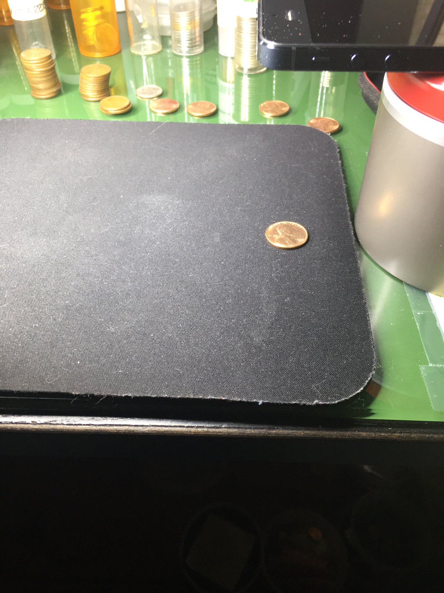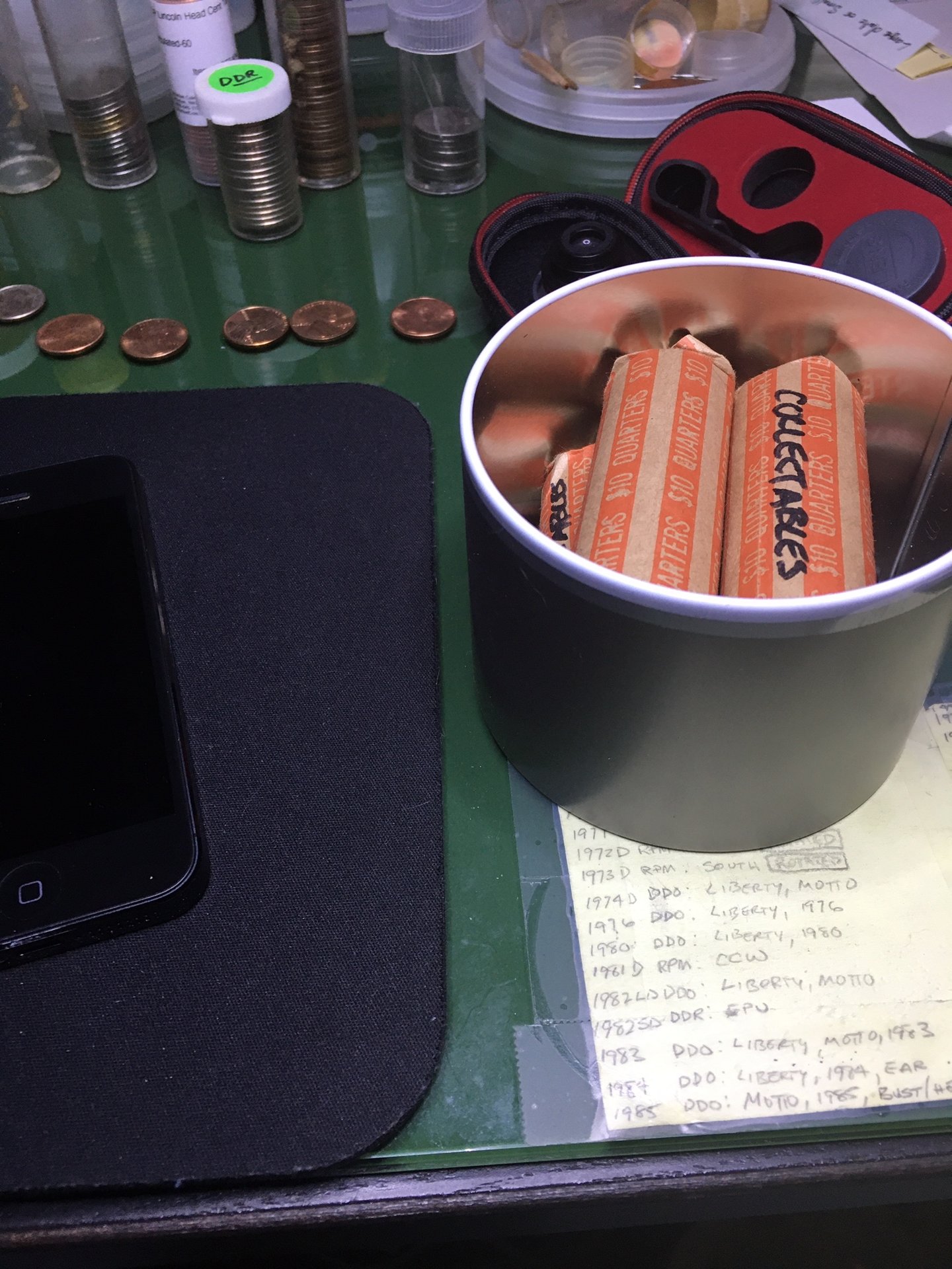 The can has quarters in it to create weight to steady the phone against. Little wiggles cause blurry pictures. The height of the can is optimal for the phone's camera (an old iPhone 5s). I use different materials to diffuse the lighting (not shown) so that I don't create glare hotspots on the coin. The black backing works well for bright cents and nickel but I sometimes use a post-it note as backing for darker cents. I do this to keep the camera sensor somewhat quiet. Steady photos set at the optimal distance from the camera (enough to fill the screen without any/much zoom) creates sharper photos. Quick and simple, but this should help your fellow enthusiasts to confirm your finds. Get creative...to me it's part of the fun for our hobby. I see many excellent setups where folks used their ingenuity to create great pictures. You might create one yourself. Good luck!