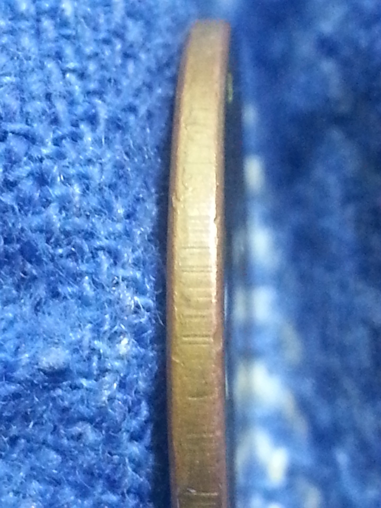 Could be press marks as mentioned before. Also reminds me of an Ebay article about fake coins - Coins on left are fakes. Coins on right are genuine. Fake coins are thinner and have striated edges which are slightly beveled. Genuine coins are thicker and have smooth edges. I want to share this webpage with you - http://home.comcast.net/~nss_rba/replicas/replicas.htmhttp://home.comcast.net/~nss_rba/replicas/replicas.htm