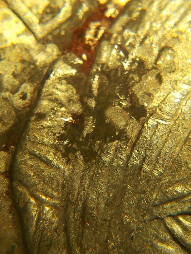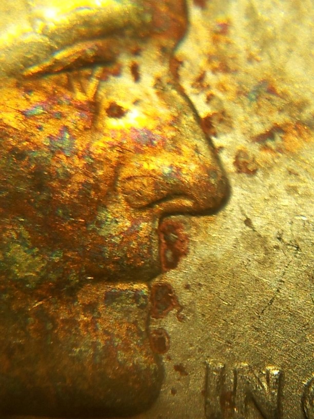 Bump. My coin has some mint luster to it around the whole coin. And the dark spots seem to be a different tone for the coins with lighter grey tones around them and the copper tones as you see in the pics.