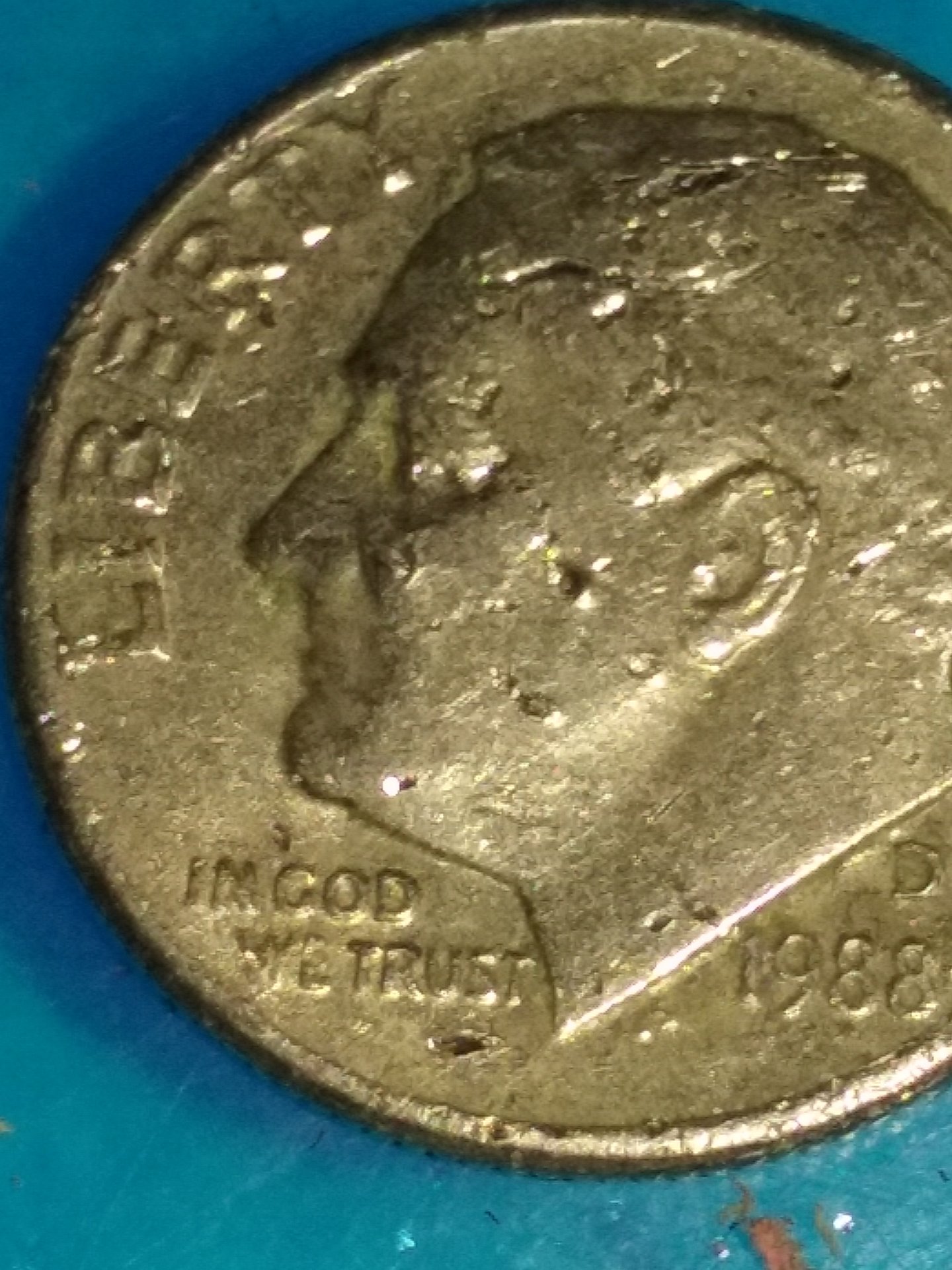 Ok and around the top of the head it looks as if t was punched too hard maybe lol. Not sure really new at this and ran across this dime in my register tonight. Here r the new pics.