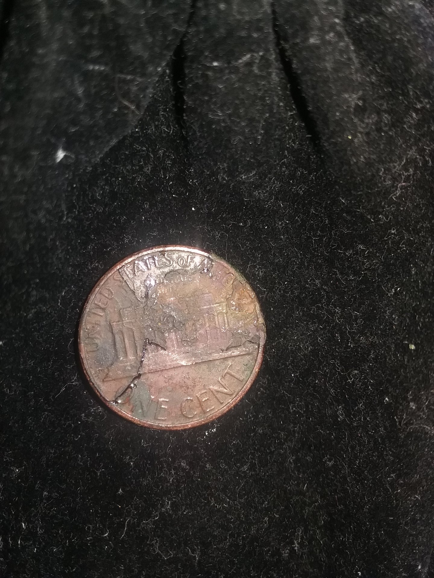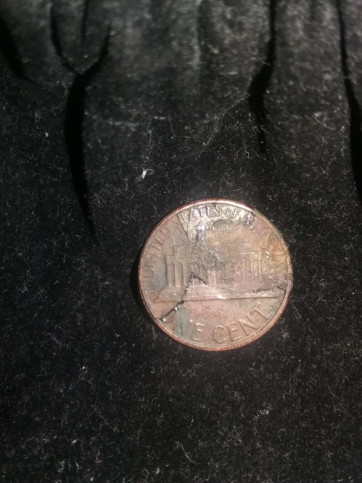 Looks like the corrosion went thru the copper and barely started to attack the zinc core. Likely attacked by some weak acid. When you physically removed the copper salt (aka: corrosion), you exposed the discolored and very slightly corroded zinc core. The good news is you were experimenting with a coin worth only $0.01! A very inexpensive lesson in coin conservation.