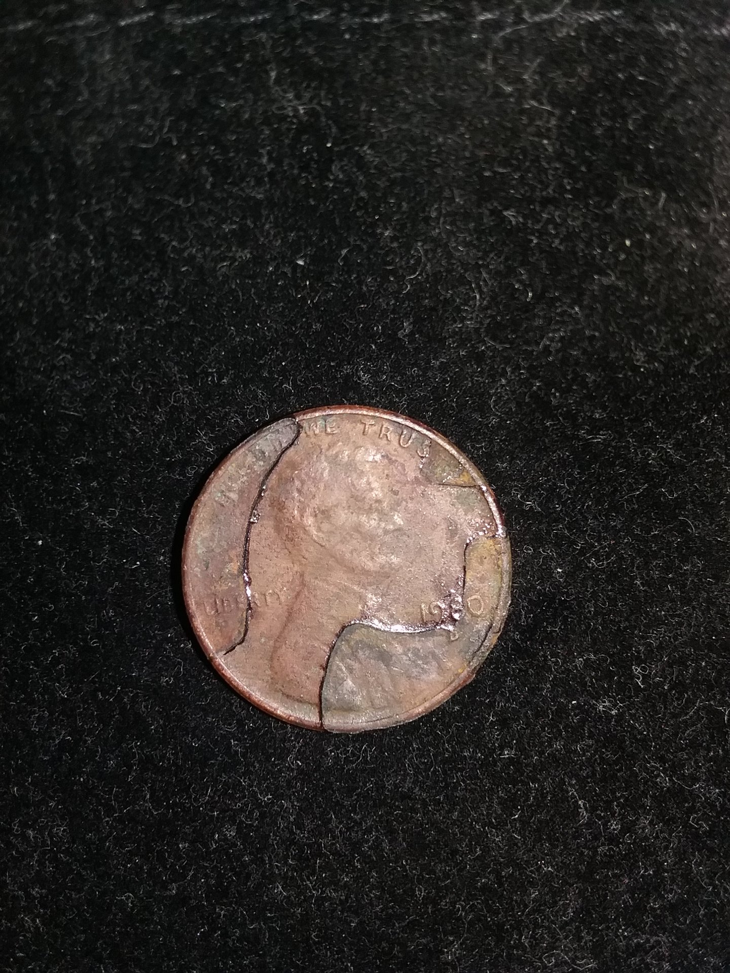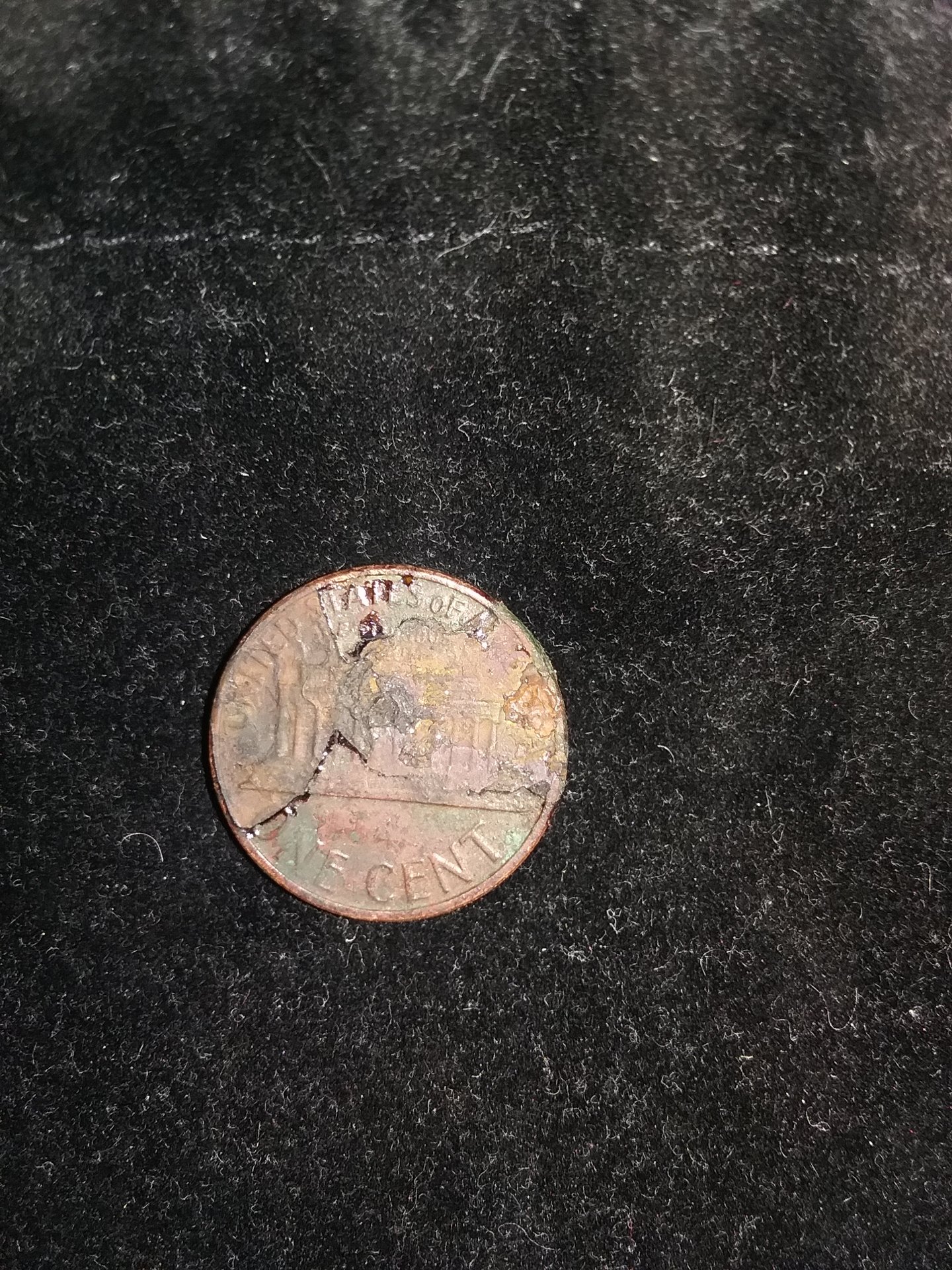 1980 cents were still bronze / 95% copper = no zinc core. The coin looks to have been coated with clear epoxy ? You can try applying paint stripper and scratching at the 'melted' epoxy with a toothpick - epoxy resin won't dissolve, just soften.