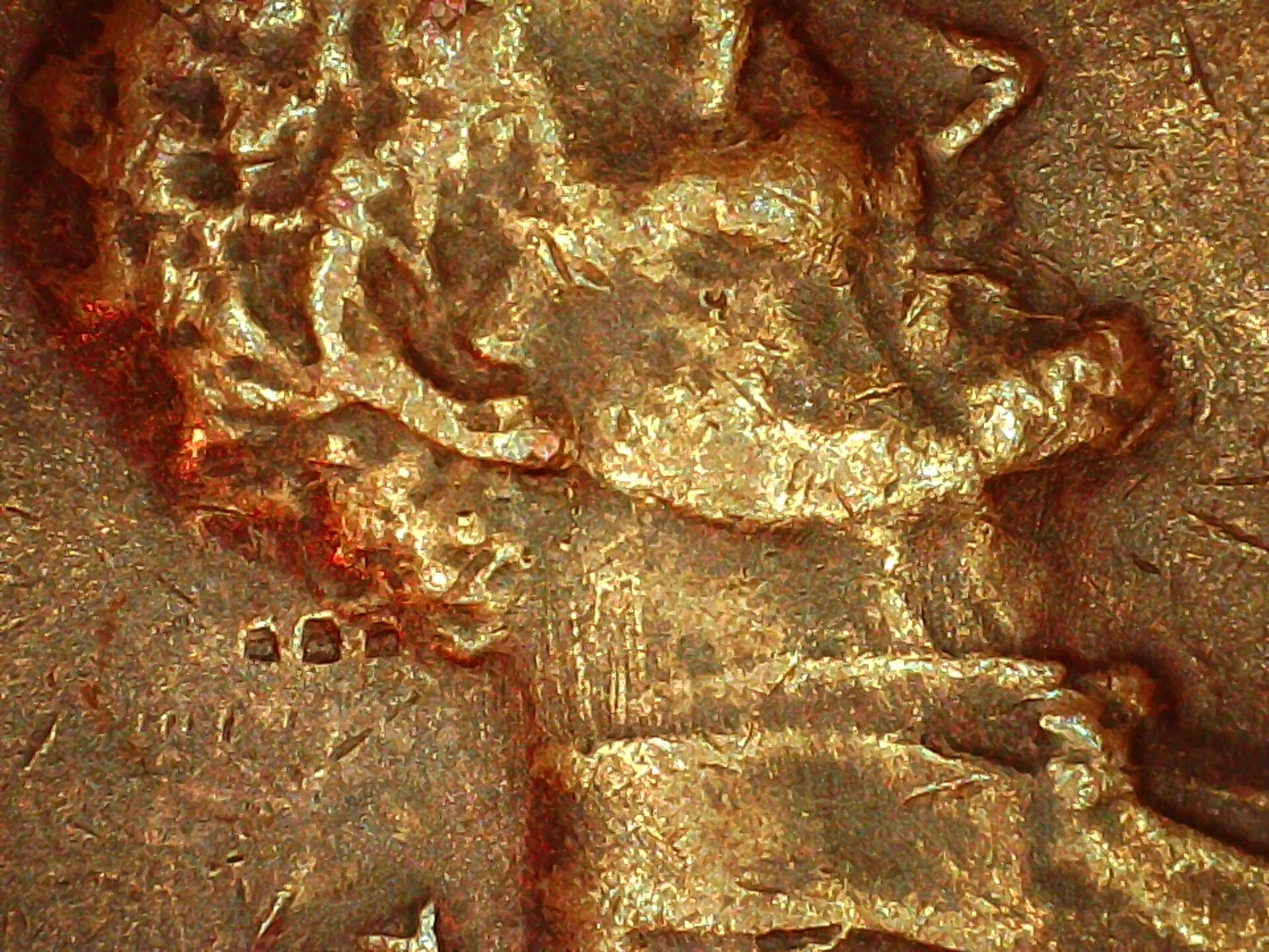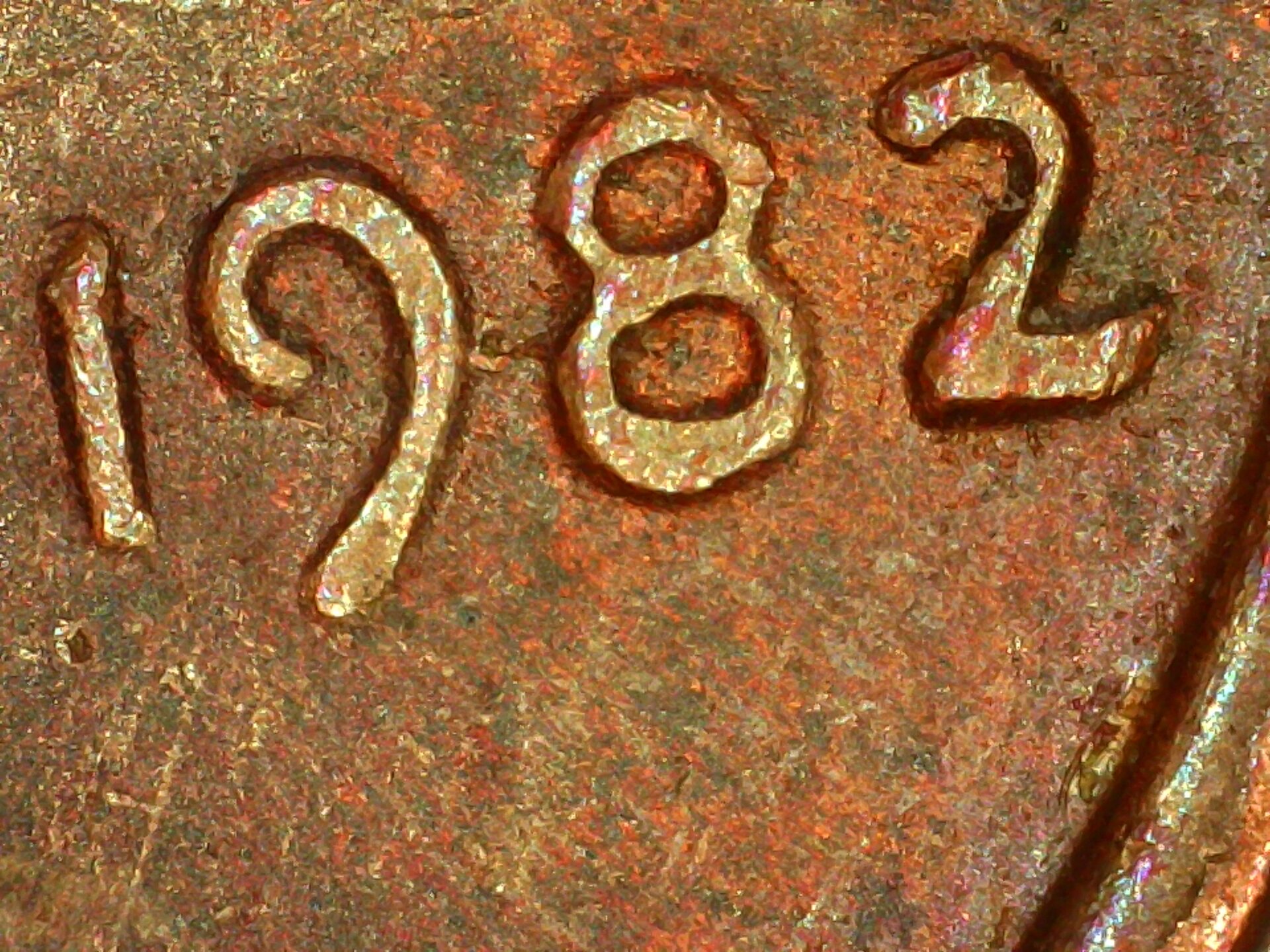 This 1982 large date sent weighs 3.08 g. The date looks like doubled die also the ear, chain eye, and nose as well. But I do not know what to say about the mouth! The reverse letters are so weird! Is this an error coin or DD/Abv/Rev? The obverse color is goldish black.