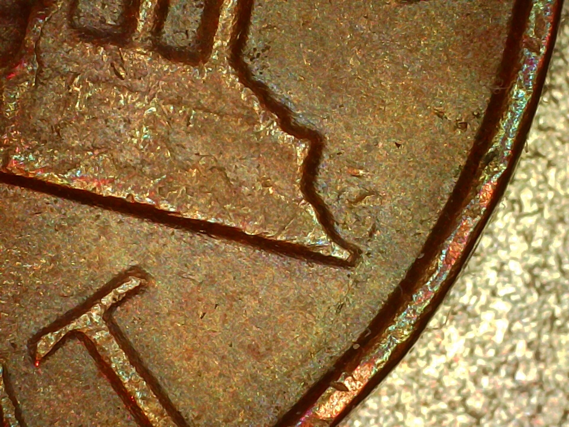 No mint mark means Philadelphia mint,Large date.Just looks like a lot of circulation damage with wear and tear no doubling or errors whatsoever.