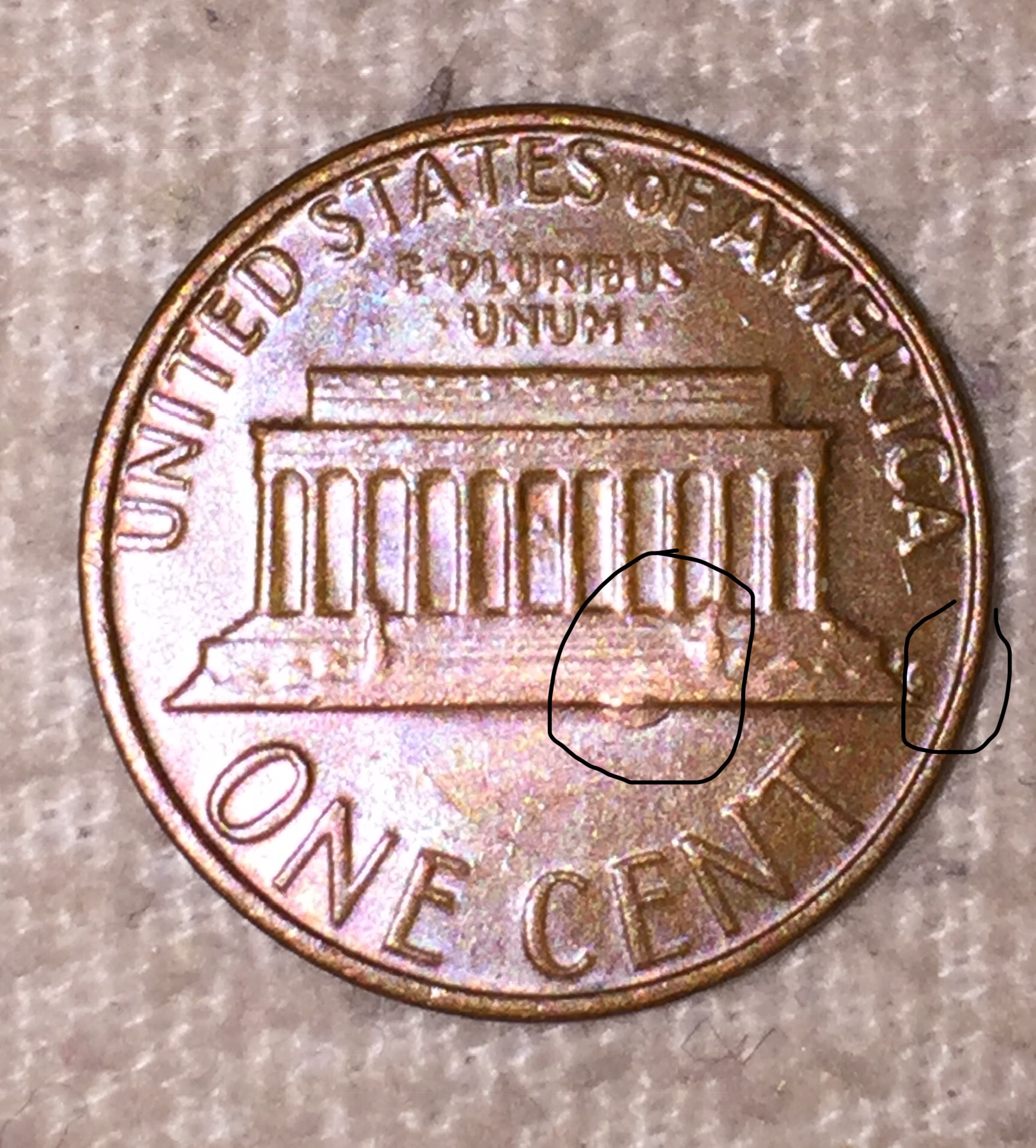 possible plating bubbles if its a zinc cent, or die chips if its copper. Does it weigh 2.5 or 3.1g? And the "back" is called the reverse. And its a Cent, not a penny.