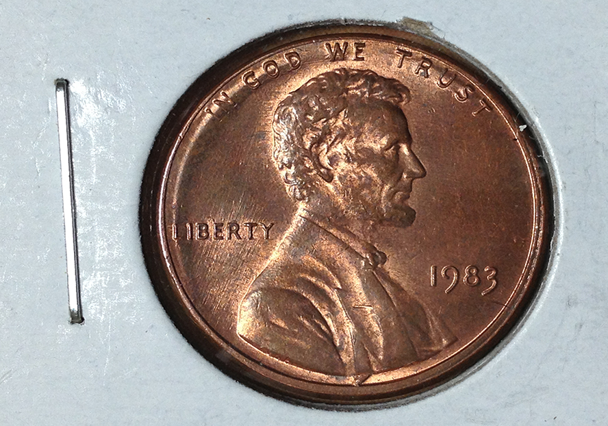 It's a slight die gouge under the bust. The circular anomaly is the result of being struck by a worn die...and the neck and beard show signs of a die that has been overly abraded to correct damage caused by a clashed die. This is all common on a 1983 cent.
