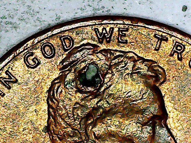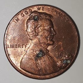 Nasty, those plating bubbles have opened up and exposed the zinc under the copper plating. It's a spender due to damage. Spend it before it erodes away.