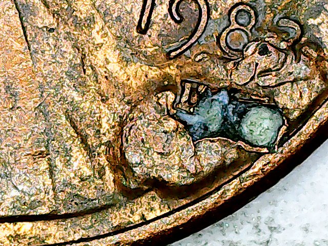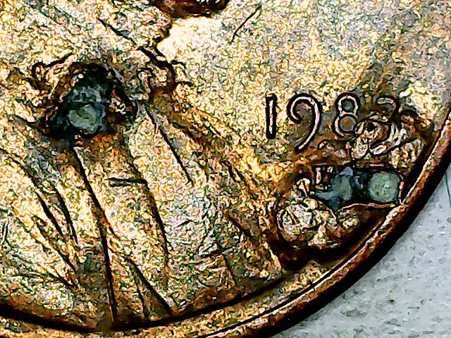 Remember the copper on most 1982 and post 82 cents is 8 micron thin copper plate on a zinc core puck. Zinc is cheap but bad for collector stuff like coins. Plating blistets, gas bubbles, super thin copper plating stretching and ripping. Just read up what happens when zinc is exposed to the air or even hot water or steam like as found in dryers. edit: I should add. once zinc starts going it is like water on a freezing day under a road. It lifts it up, splits it up. Except it doesn't stop. you can see all the lifting and stuff around the date. It's not going to stop until the entire cent is eaten away. @sunday13 You should keep this and put it in a glass jar in the sun, and return to it from time to time to see what happens to it. A good, cheap science experiment.
