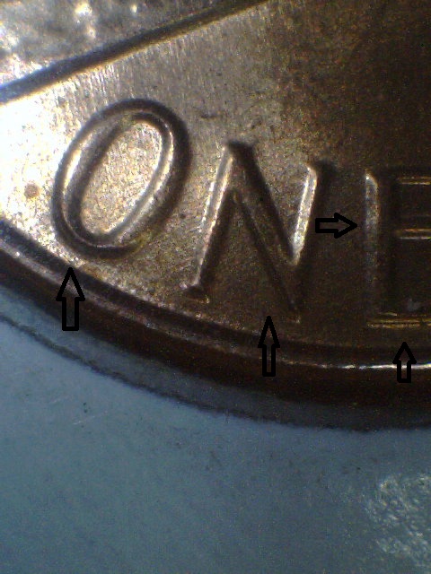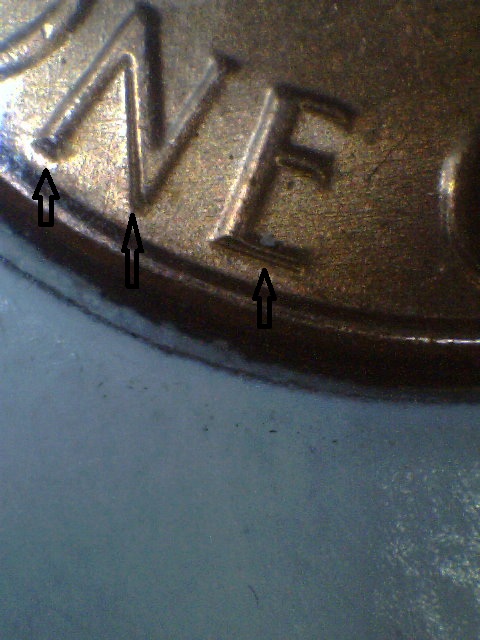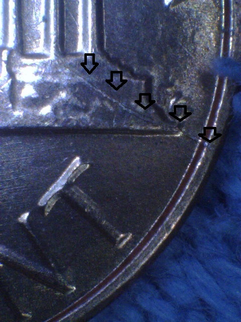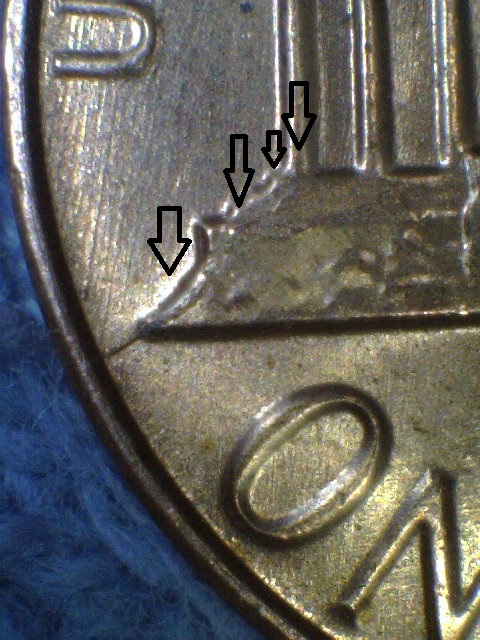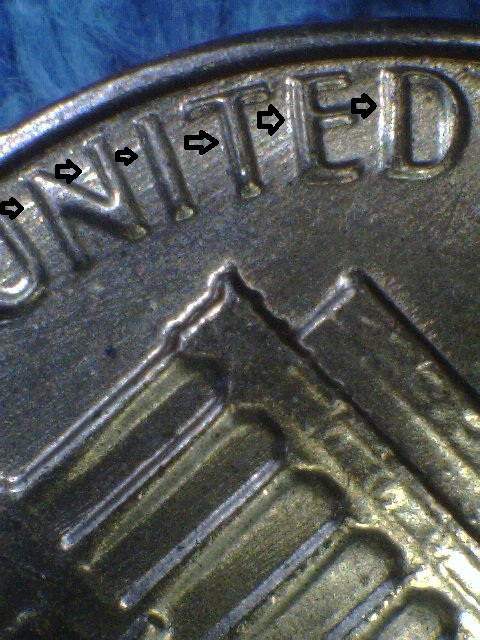 The photos might be tricky. At times the word one looks almost like md to my young eye. Although when looked at with my 60x hand held itdoes not have a 2 dimensional/ flat /shelf like look to it. It has a ripple appearance. Does not match either on coppercoins if it is. Any estimated value? Do the die cracks add to it? Amy advice would be appreciated. Ty