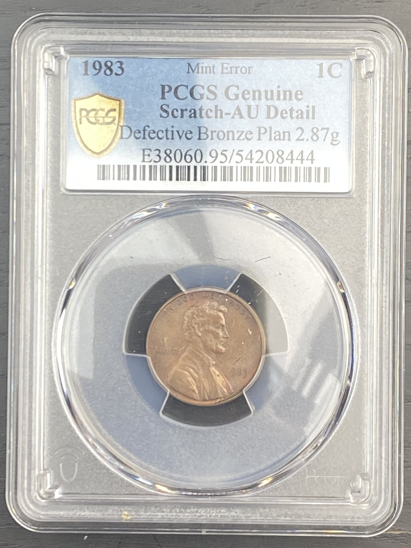 I recently had this 1983 Lincoln cent evaluated by PCGS and it was attributed as struck on a defective bronze planchet weighing 2.87 grams.