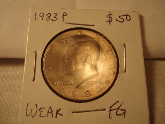 I'm not sure if these are collectible but I know I read it here on CT that Frank Gasparro put his initials, FG, between the eagles left tail feathers and the left drumstick.. :eat: er the left thigh on the reverse of the coin. I'll post some photos soon. The reverse photo shows some dark grey stuff that is probably from plastic on the flip. It is not on the coin in hand. The title should have read: 1983 P Kennedy.... Bruce