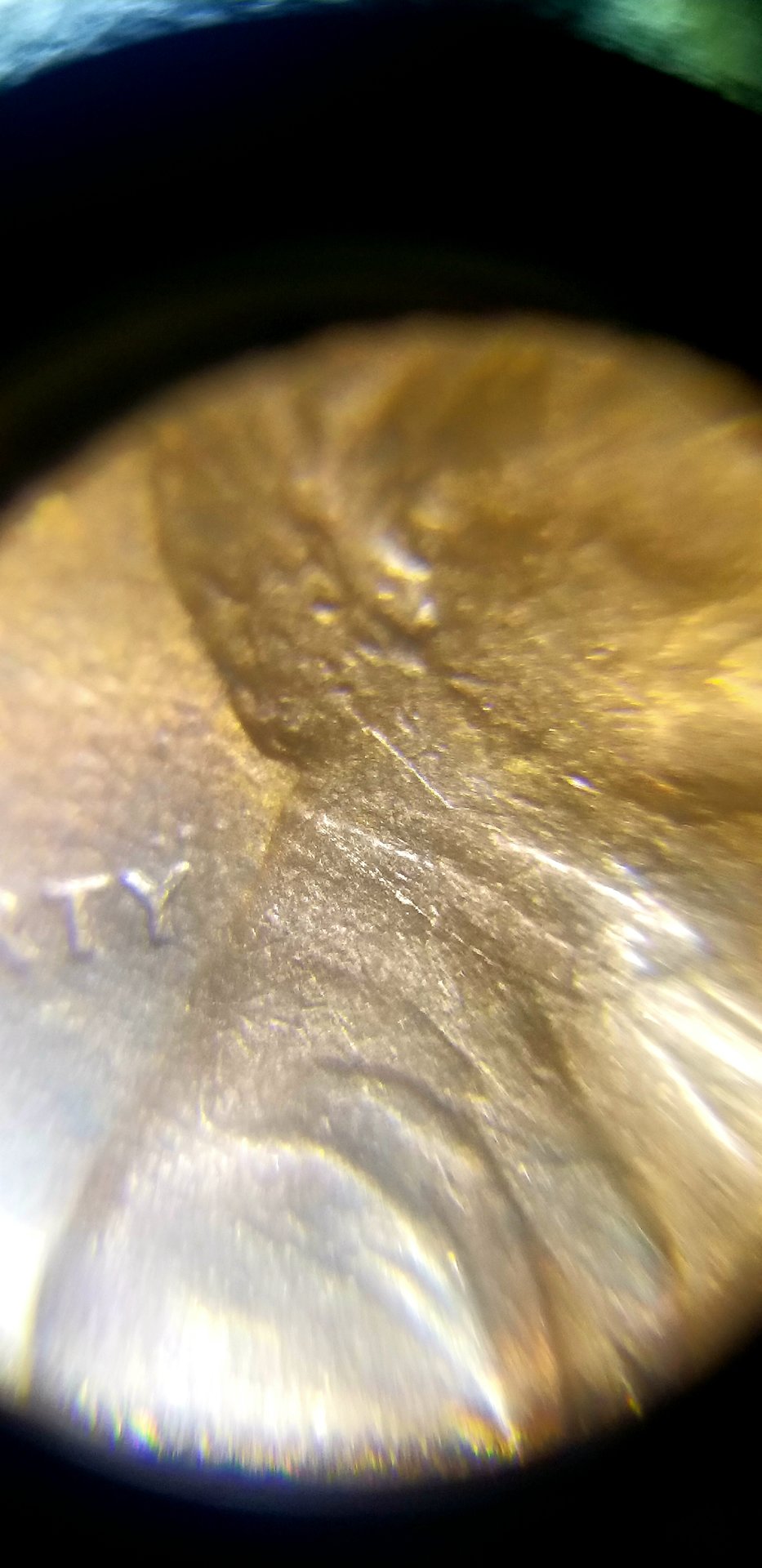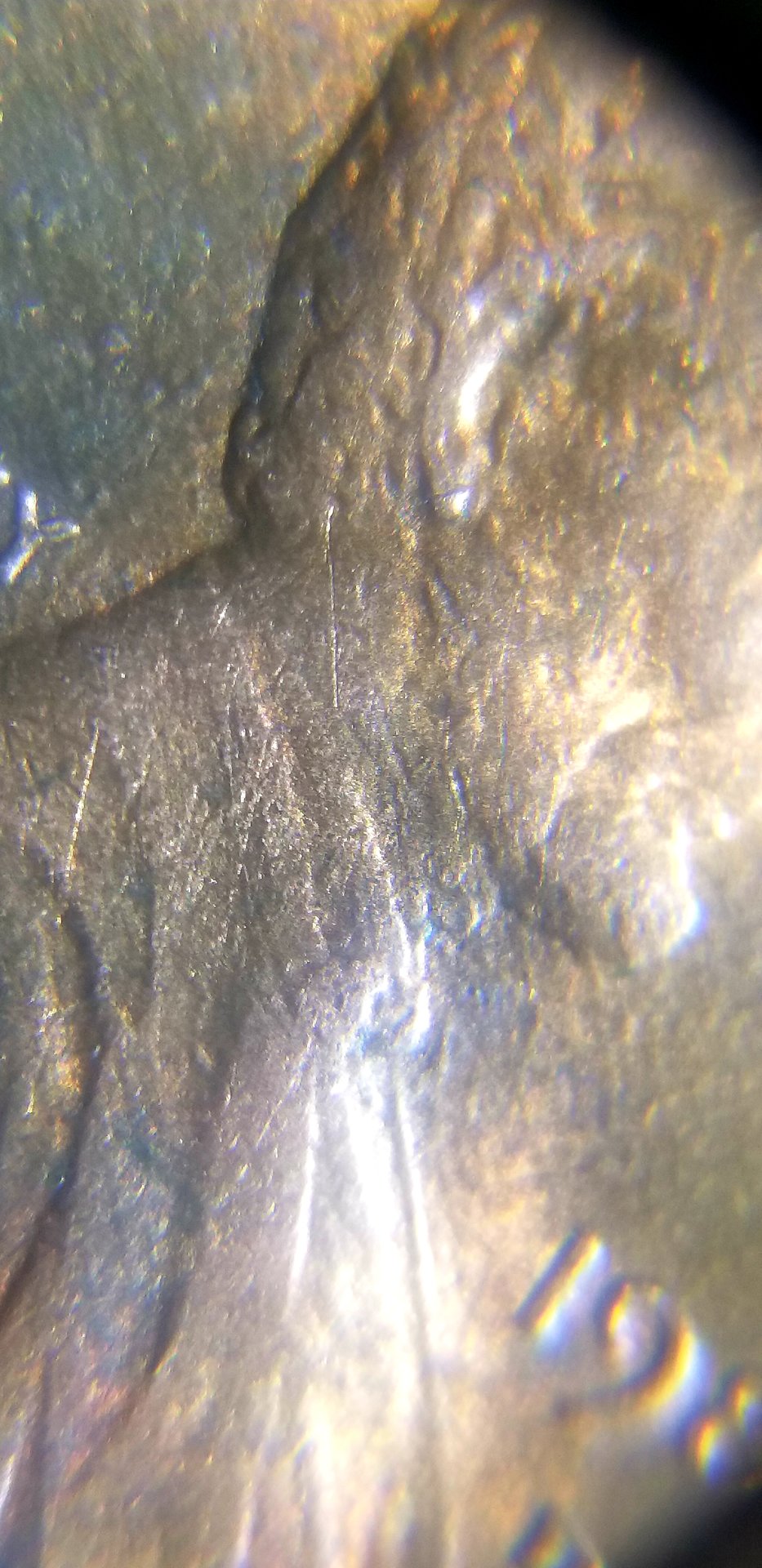 Wish I could take better pics but it can be seen with the naked eye as a finger print but is not I hope. Goes through neck line and lettering of both strikes is visible. Reverse is about the same in appearance but can't make out the country of origin as it seems some letters are english and others appear to be of another language. Any help would be greatly appreciated.