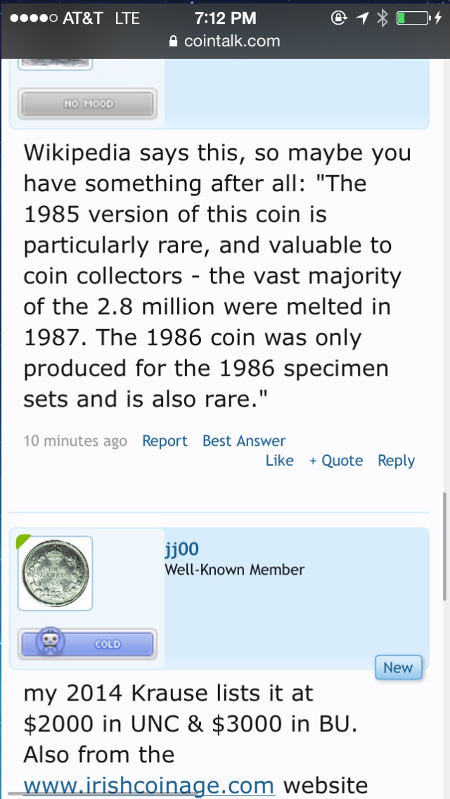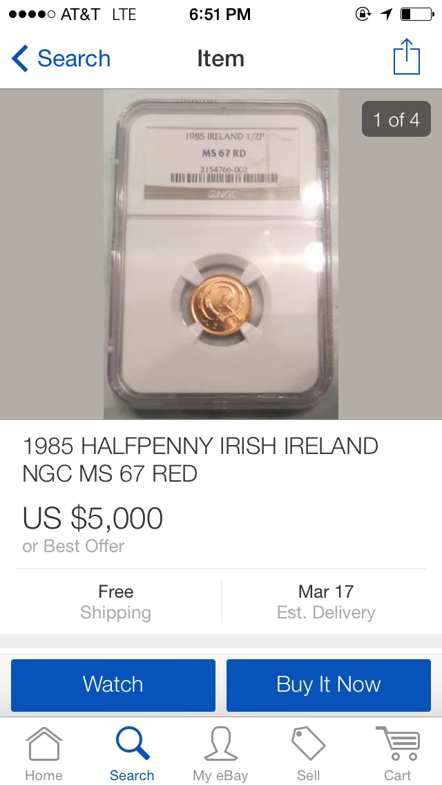 Very rare coin, very cool that you have one. When I read the title I was thinking it was about some common 1970's irish halfpenny that is only worth a couple cents of so but after researching it I was amazed to find out how rare it is. $2000 is around what it may be worth. "The 1985 halfpenny was produced in circulation quantities but many of these did not get to circulation and were returned to the Central Bank and melted when the coin was demonetised in 1987. But some coins did escape and fortunately some of these were used to make up private souvenier sets of the coinage so the coins are not as scarce as was though some years ago and they are available in bright uncirculated condition." Cited from http://www.irishcoinage.com/DECCAT.HTM