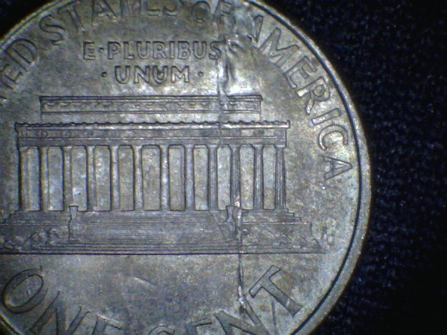 the PMD i was referring to is under the A in AMERICA and in front of the S of pluribus. is it a lamination? the missing A is rot, correct?