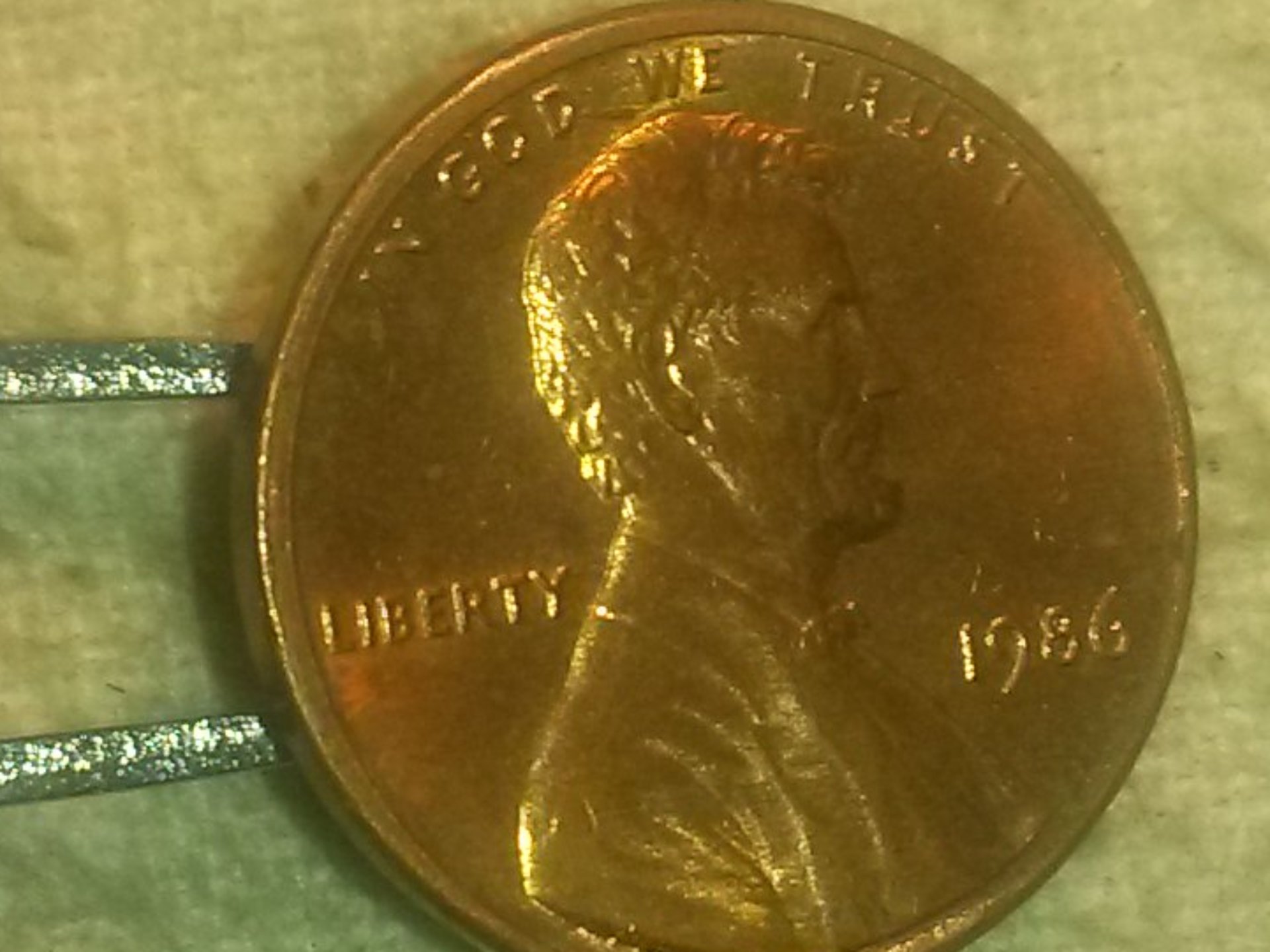 Found this 1986 penny but not sure what these extra marks right of the d and left of the u would be considered.