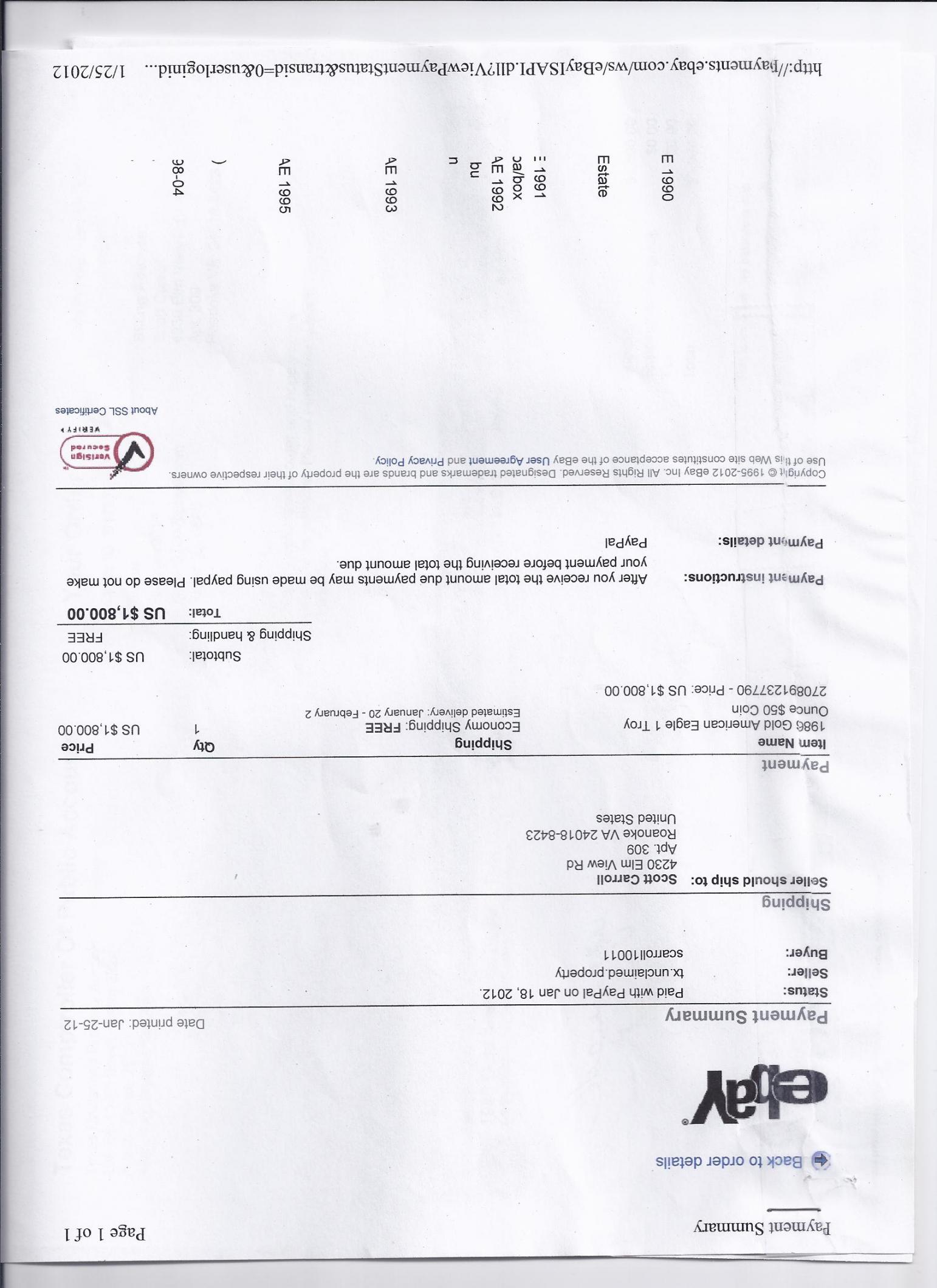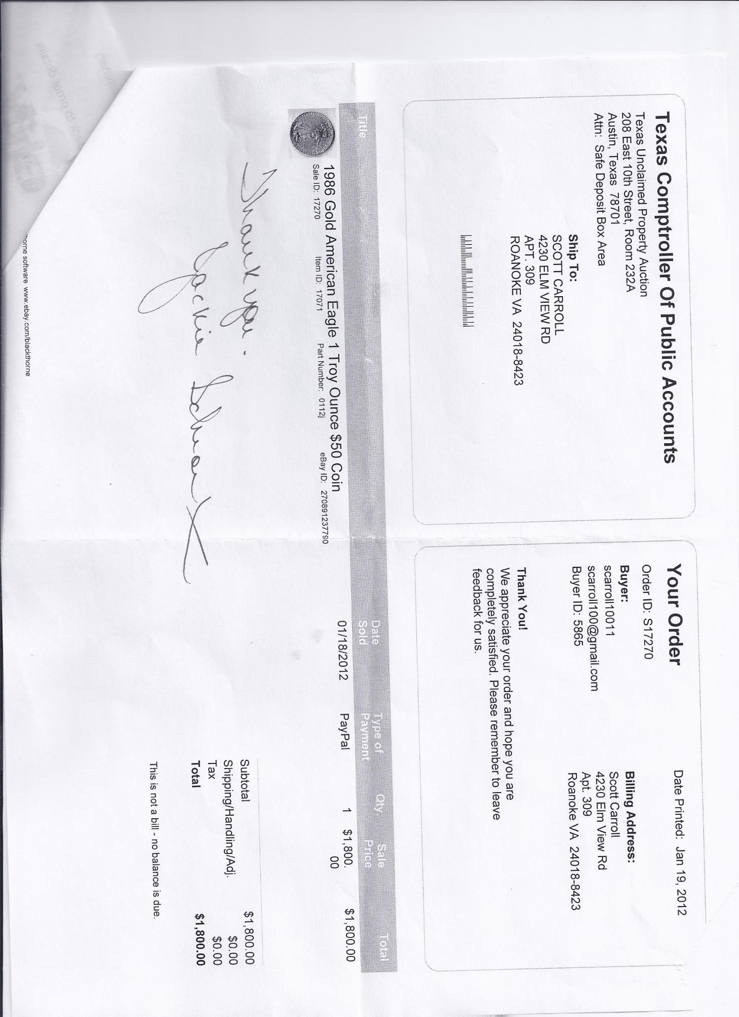 1986 Roman Numeral 1 Oz. Gold coin !!! WoW !!! A real Treasure won at Auction at Texas Unclaimed Property (on the Net)... WoW! Won this coin and is it impressive (not in airtite) in plastic folder as received from Texas... WoW! That's all I can say about it ... I don't really collect gold coins as they are usually out of my price range; but I Lucked out on this Beauty and now am willing to part with it; This is a one coin item a Real Rare Treasure and it will cost you $2000 to make it yours but again I say it is Rare and Gold (1 Troy Oz.)... WoW! I hardly ever sell Gold, if you want this one get back to me quickly as I don't expect this one to last...PM me today !!! Grampa :yes::thumb: Looking to buy a fairly lg Silver investment; with the proceeds going to my grandsons College fund...Grampa... Remember Our Service Men And Women Defending Our Freedoms (Freedom is not Free) :thumb::thumb::thumb: Here are the actual Receipts of the purchased $50 Coin from Texas State Comptroler's office...Make best offer ...Grampa...:thumb: :yes: