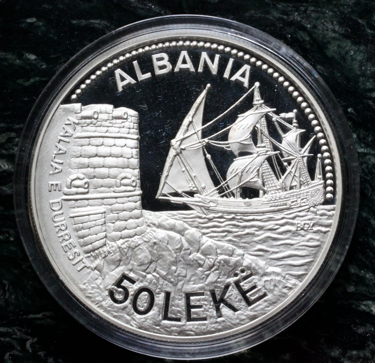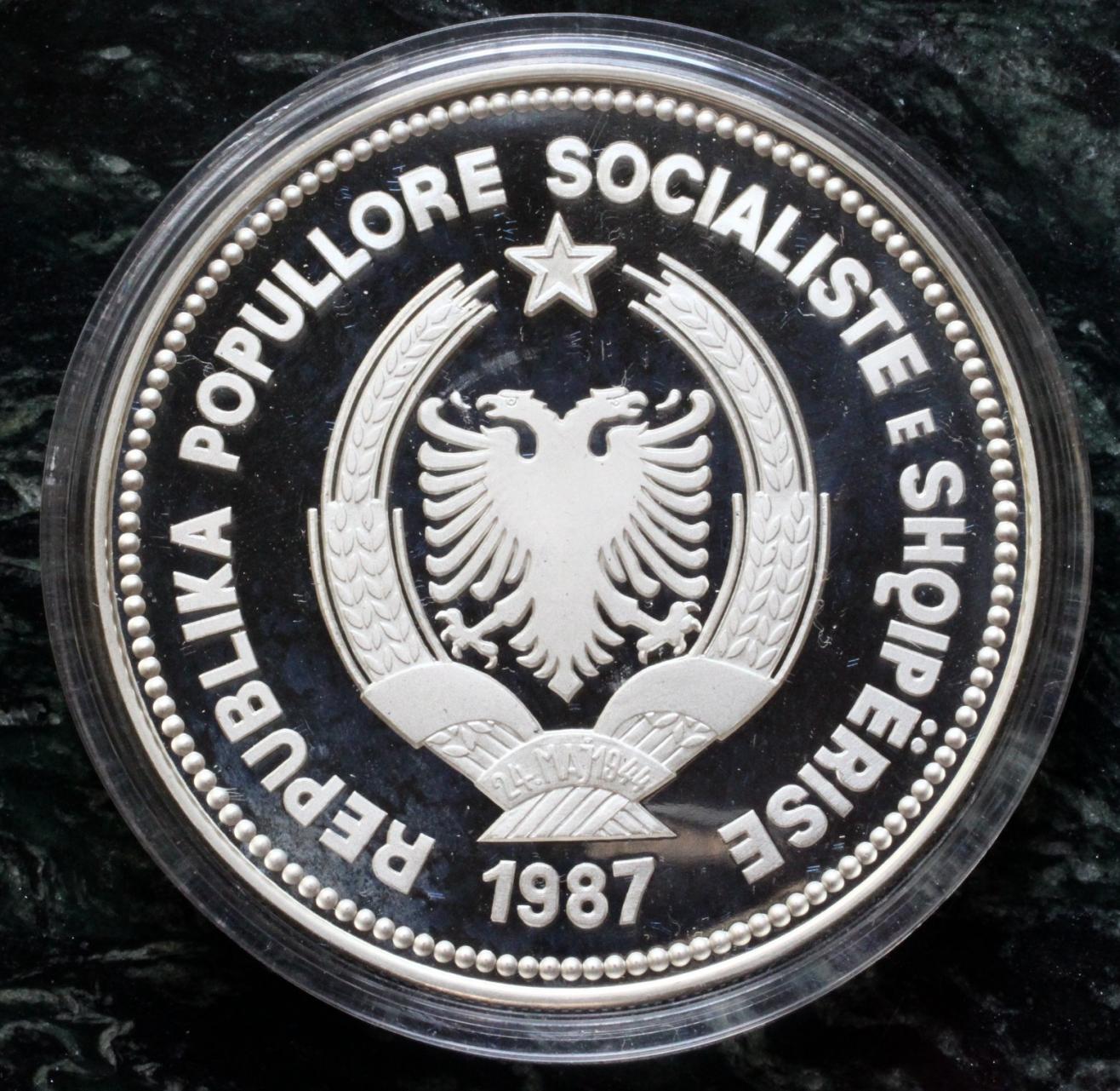 1987 Albania 50 Leke, nice proof in capsule. Weighs 5 Troy ounces net. Faint touch of fog on reverse along edges, otherwise fully as stuck. Yours for $265 delivered insured. Add 3% if PayPal desired. email me for details.