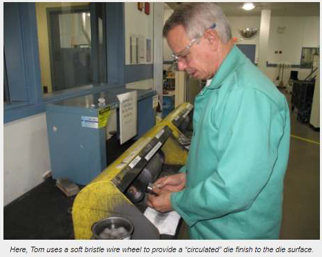 you can blame the guy at the wire brush wheel using it to "clean up" a used die during normal maintenance. Notice the caption.