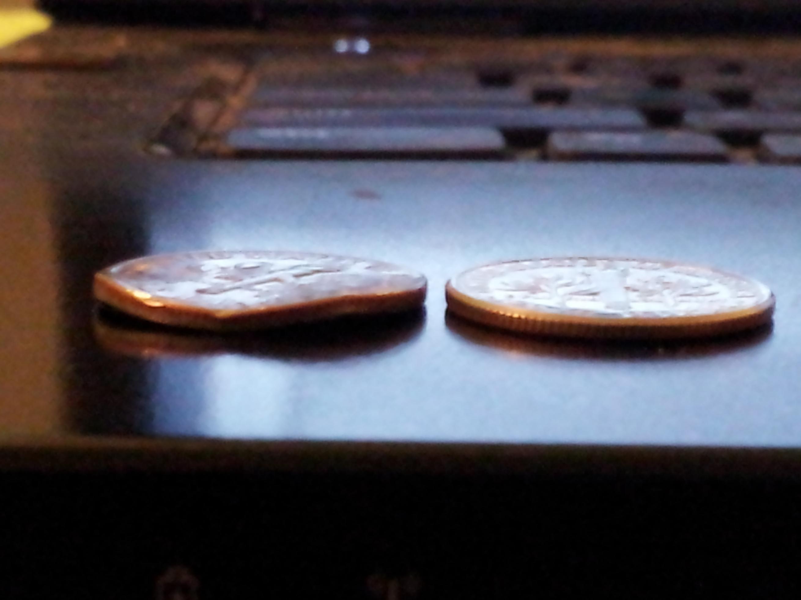 Hi I don't know anything about mint errors and I was wondering if someone can help me out here? You see I have a 1988 P Dime that is bent in a couple of places and if I lay another dime on top of it but off center it matches the bent area of the other dime. Here a few images of the dime it's on the left of a normal dime. What kind of value could it possibly have if any besides 10 cents? Thanks in advance...