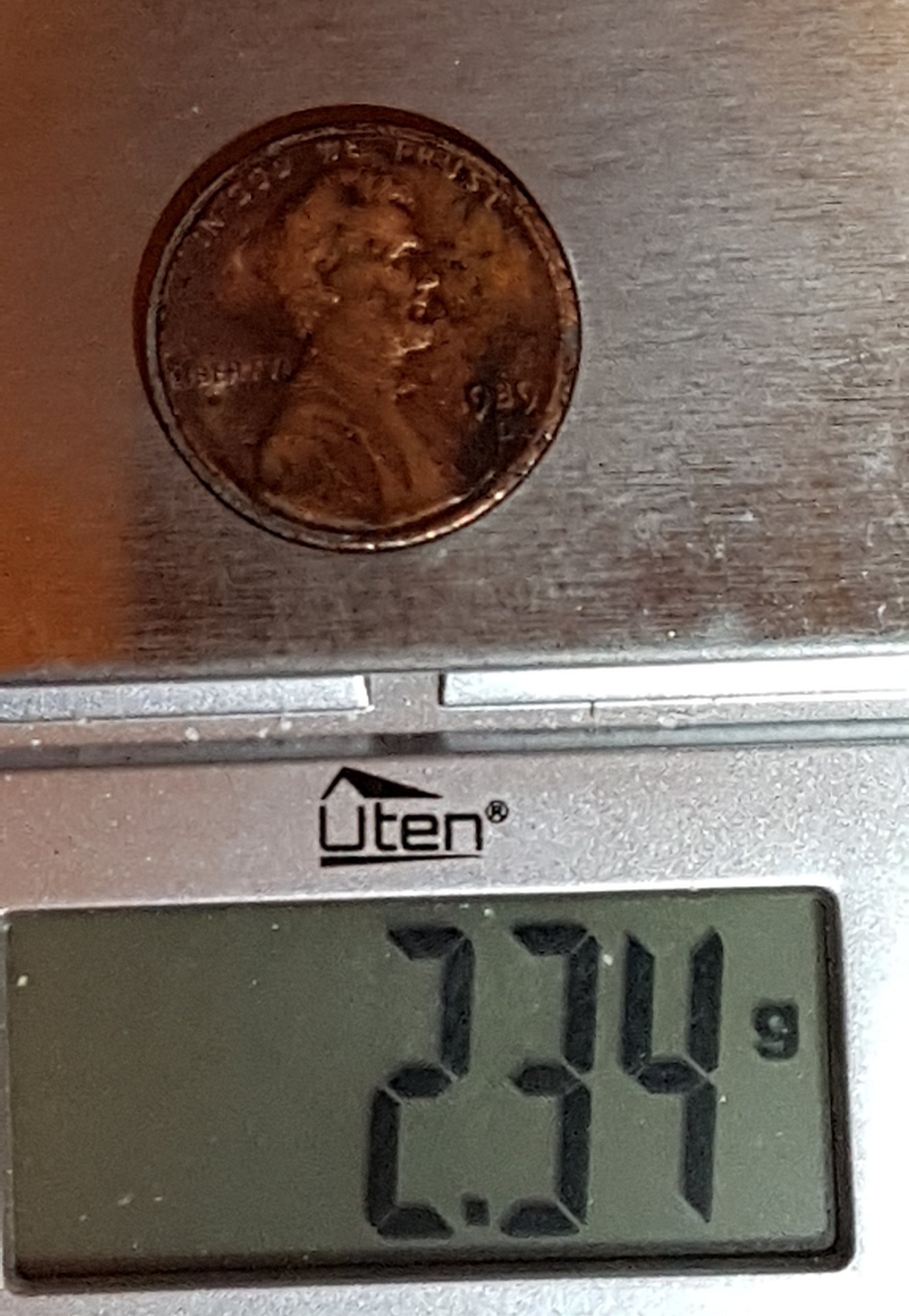 I picked up a 1989-D to put it in the cull pile. Something didn't feel right, so I put it on the gram scale. This zinc Memorial should weigh 2.50 grams (+/- 0.100 g.) but the scale read 2.34 grams. That is 0.060 g. less than the 2.40 grams that should be the lightest weight. This coin has lived a rough life and deserved to be retired to the cull pile.