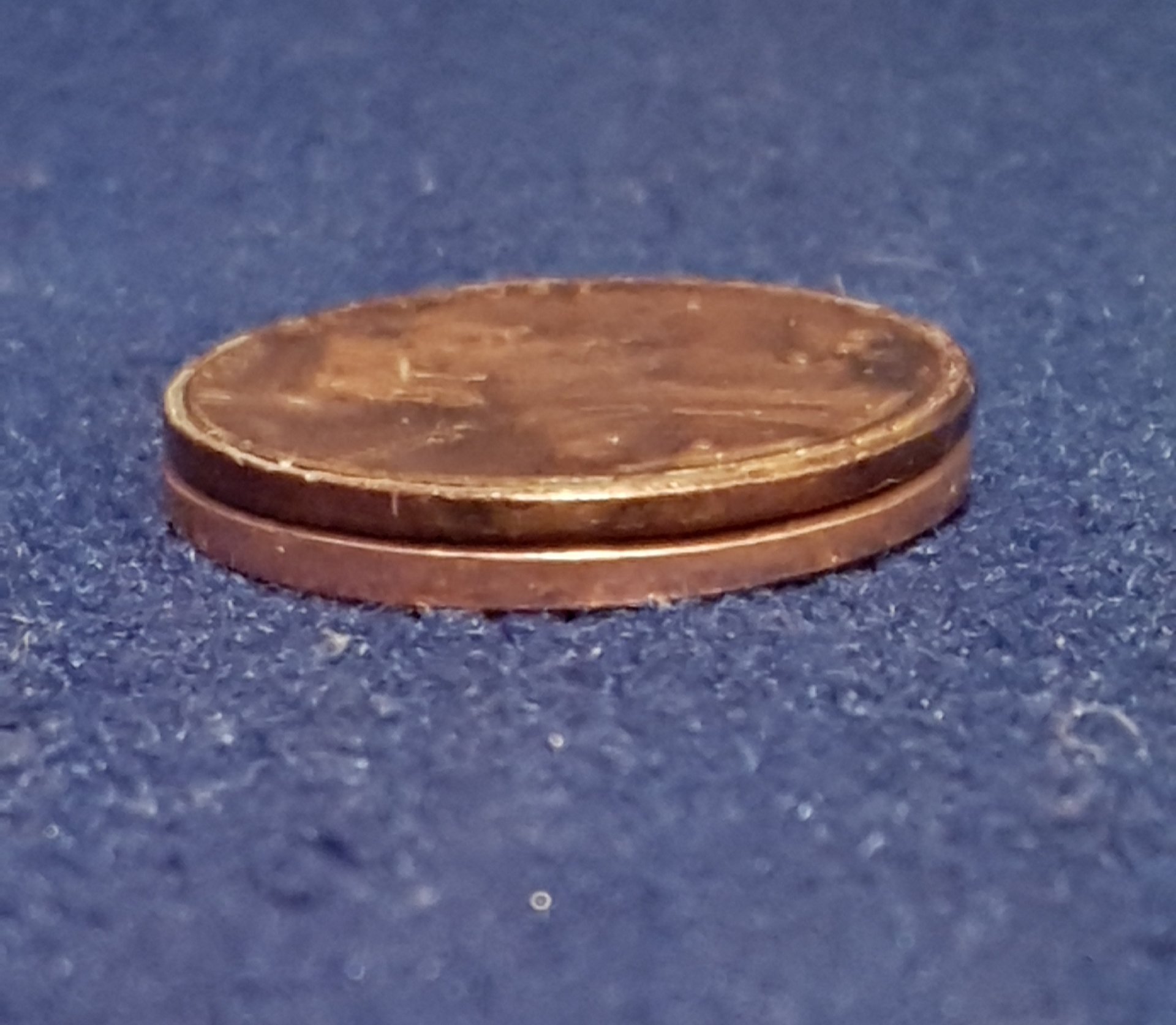 If you had a 2.50 g. normal coin and removed the copper plating it should weigh 2.4375 g. This coin still almost all of its copper plating. It does feel thinner than it should as seen in the attached photo. I can't explain this, so if you have an answer, please post.