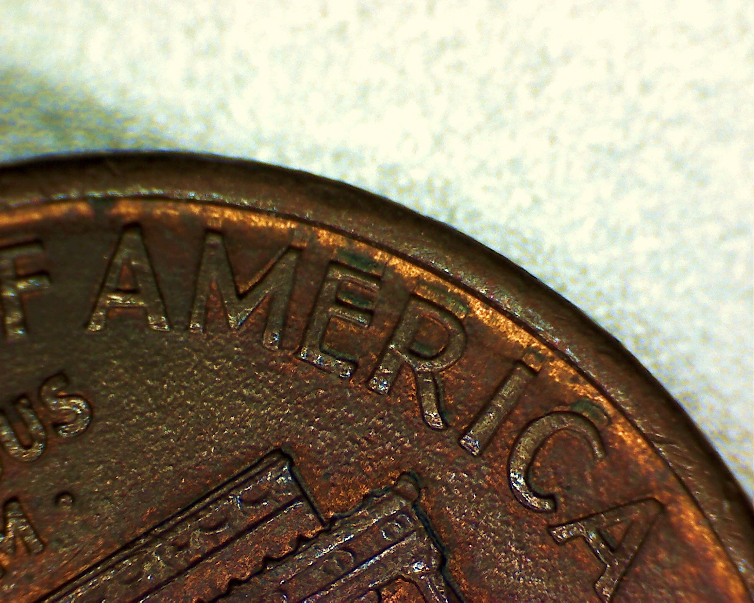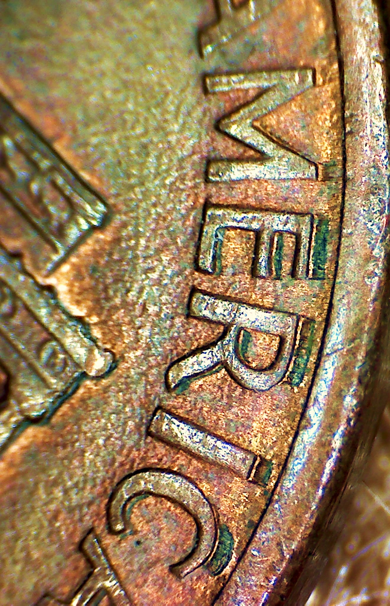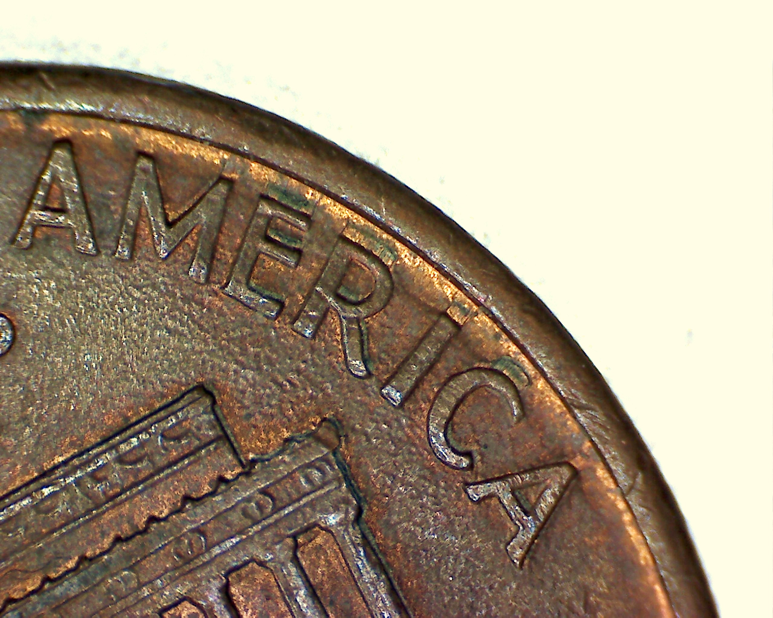 I believe this may be split plate doubling , which is caused by the copper plating being stretched and forced up into the letters of the die causing the copper plating to crack and expose the zinc core.