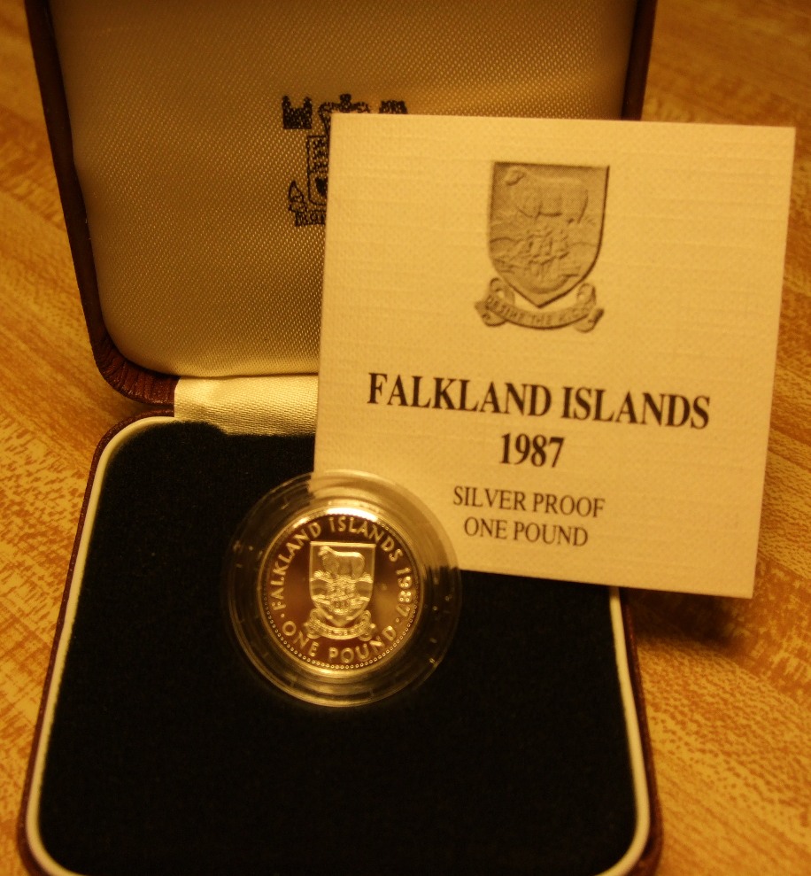 Also includes a cased Silver Proof 1987 £1 from the Falkland Islands, mintage about 5,000 pieces, according to Krause.