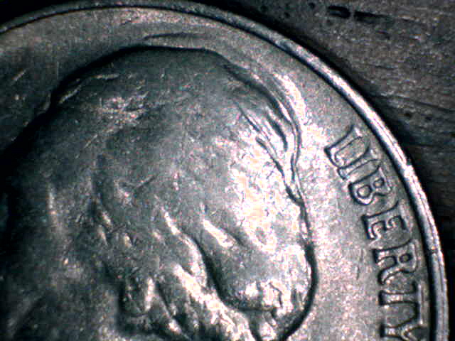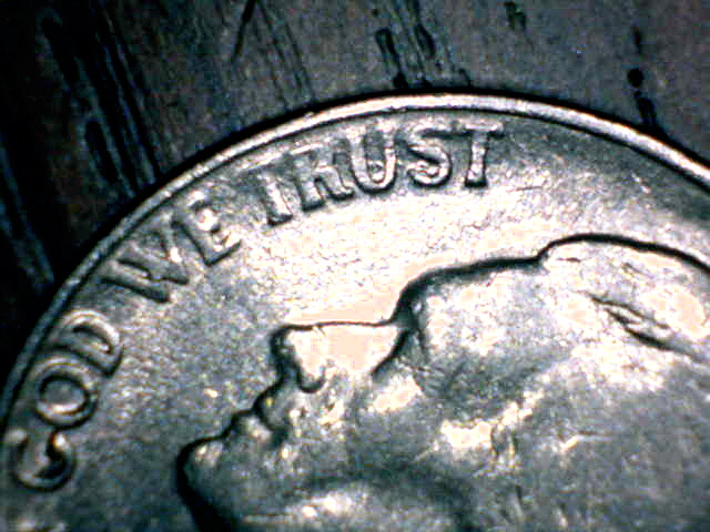I don't know what caused this extra "blob" of metal above Jefferson's head. The die appears to be in a pretty late stage. Could this be what caused it? Is the problem with the word "Trust" due to die attrition? Any help is greatly appreciated.