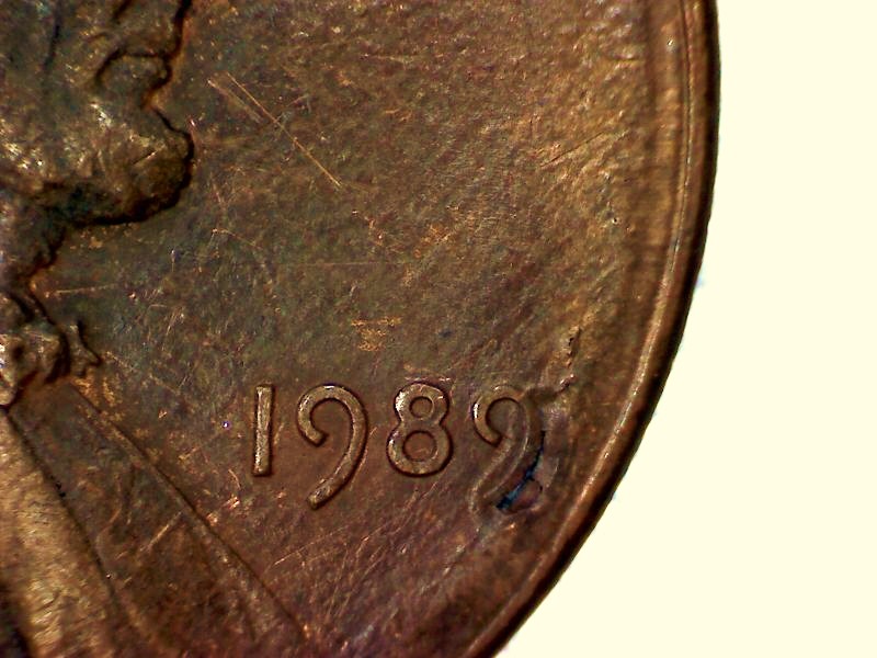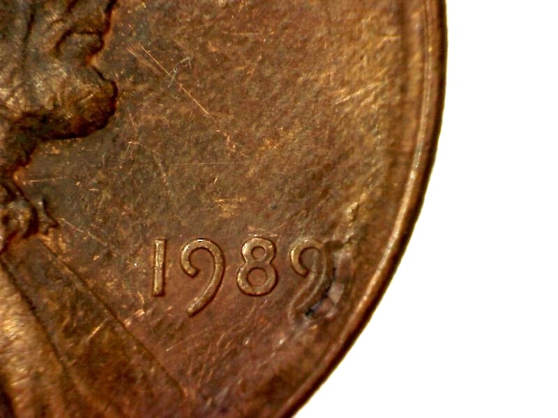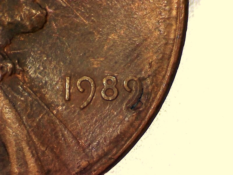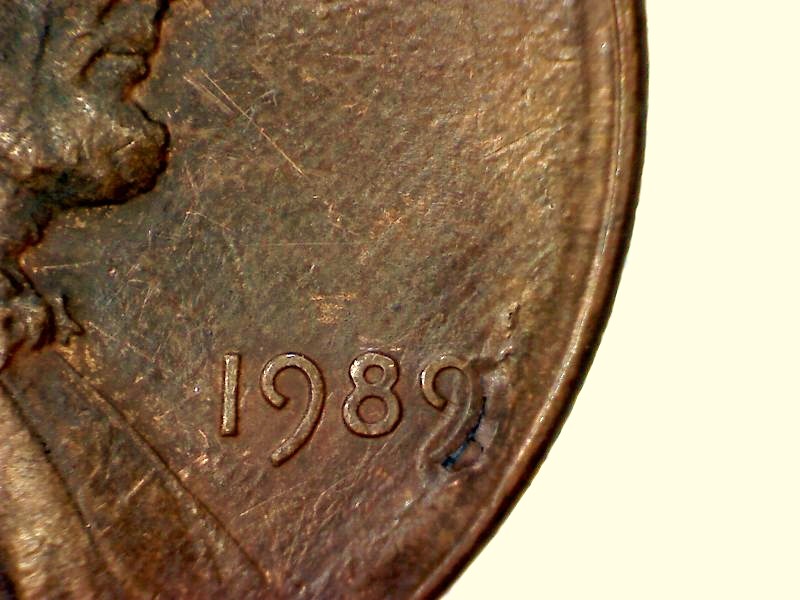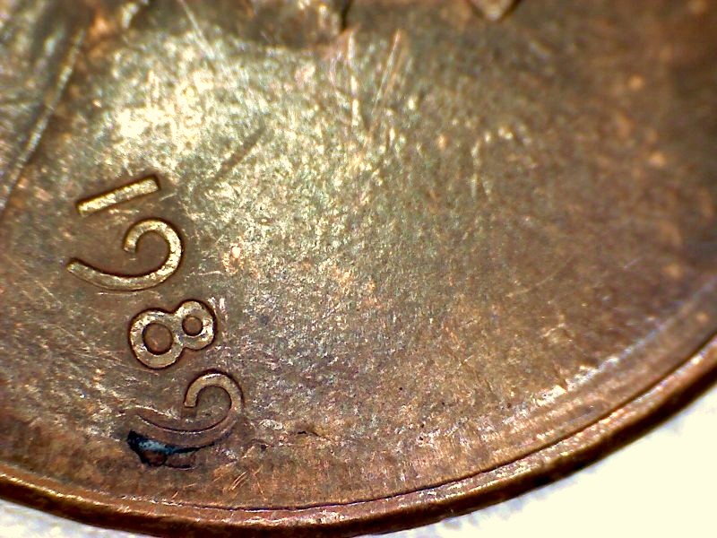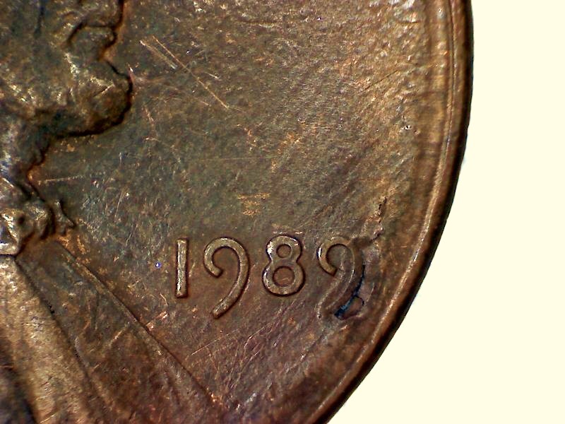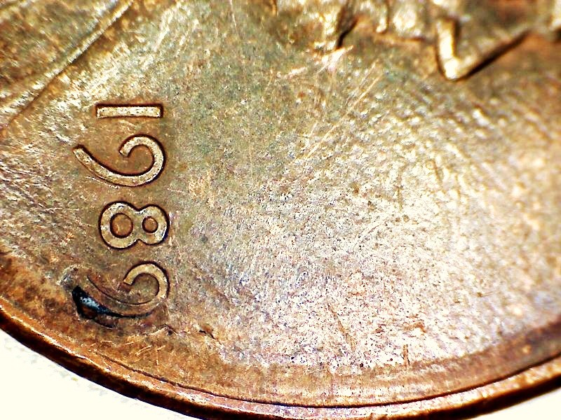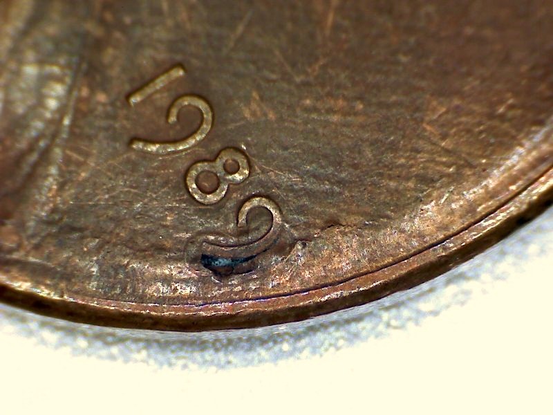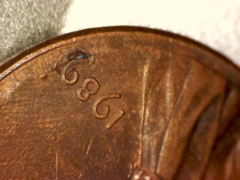 Slightly off center at date. There is a depression under the 9 with a hole that also goes up under the 9.