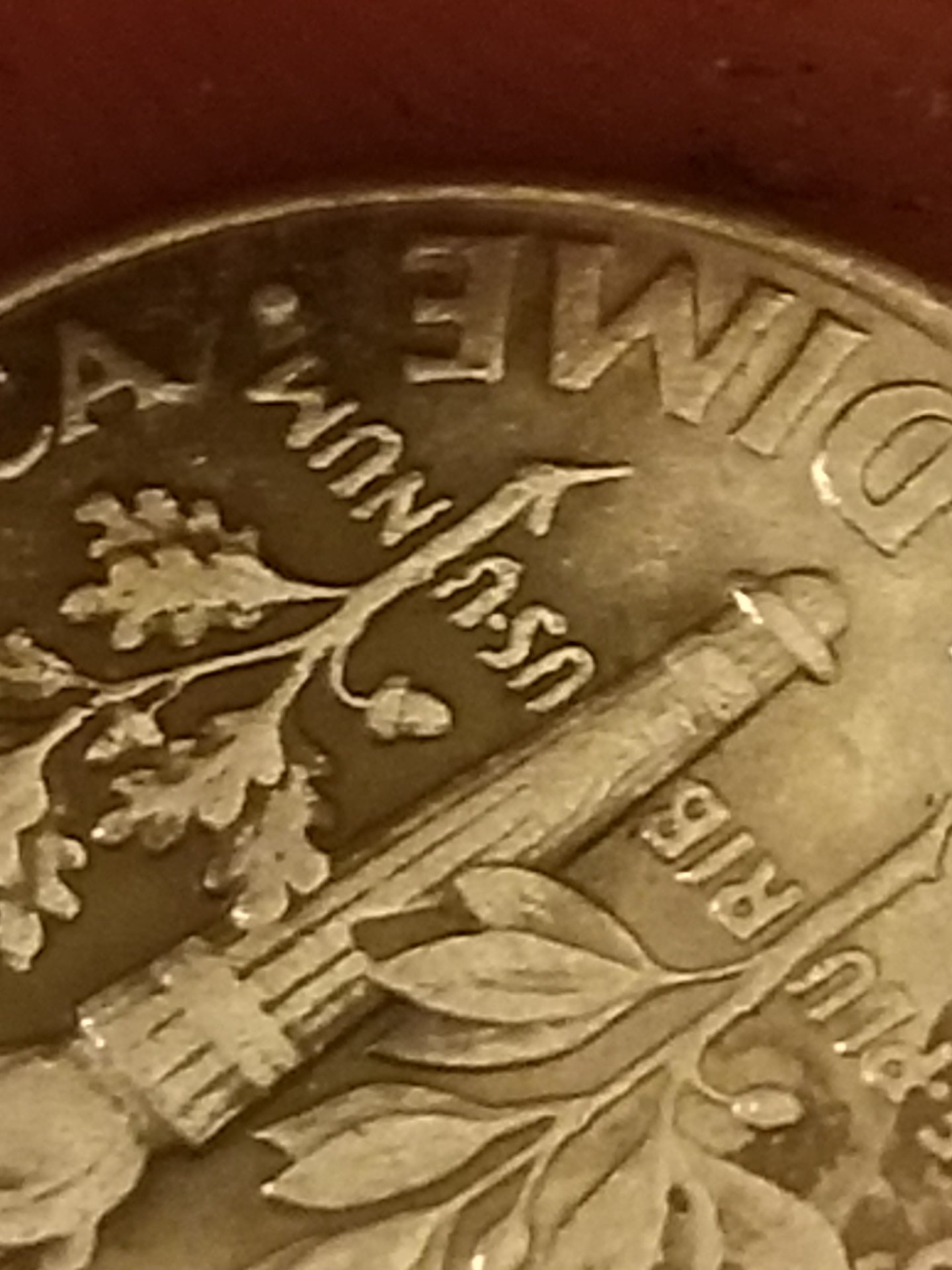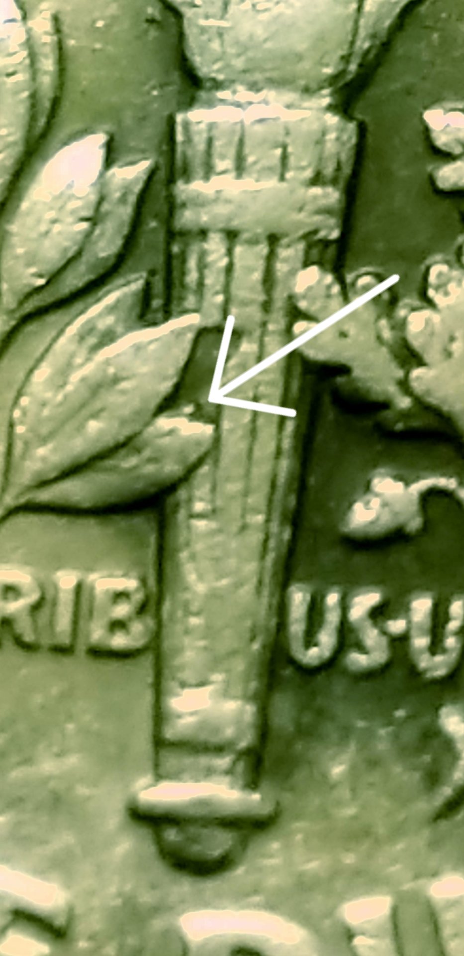 It is possible that the impression was caused by a segment of a grease & debris filled die that broke away and was subsequently struck into the surface of the coin. This is just unfounded speculation on my part, but I have seen similar occurrences on Lincoln cents when I was searching a $50 Mint bag from 1980. What causes me to be skeptical about this is that the impression does not appear to affect the actual leaf immediately to its left. I guess the only way you could be sure about it would be to have a few of the coins that were struck immediately before this one. Chris