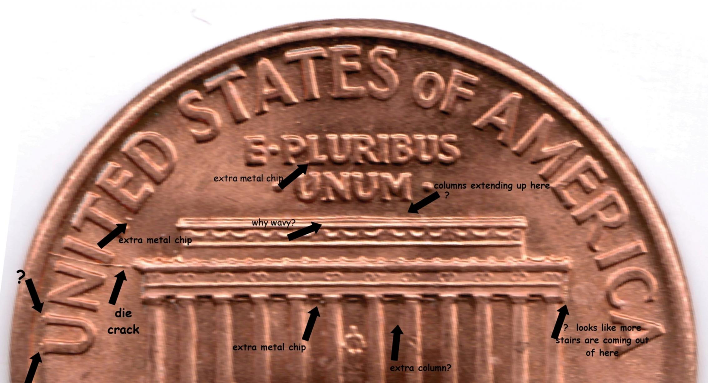 I hope this picture turns out as I have labeled some of the errors I can find, but see others I need help with. I see die cracks (one is big), and lots of others. I will appreciate all help and hope my questions are clear. See the picture which has the questions noted. I am so glad you are here to help me learn. Thank you for all your expertise. :hail: