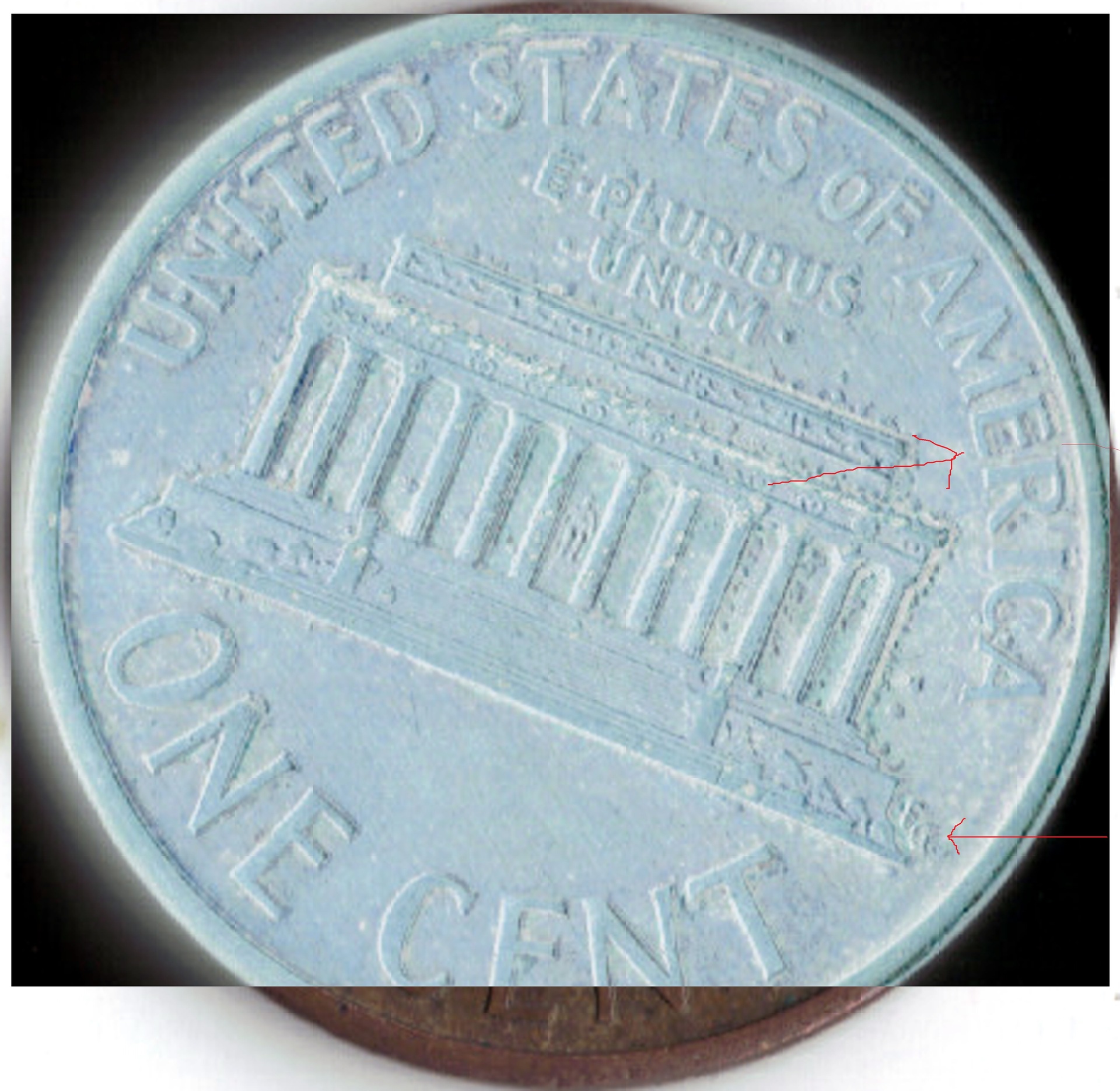 it looks like the OP may be asking about the copper plate doubling around the memorial building and some of the letters . I have seen a lot of the copper plated zinc coins that appeared to have extra letters beside of the original letters because of the copper plating swelling up after the strike. the darn copper plating issues is going to be very confusing to some of the new error coin collectors.