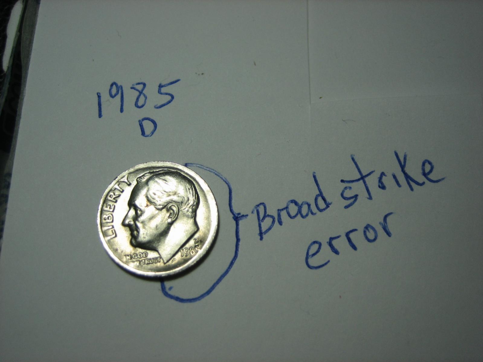 Ripley your coin don't look like a broadstrike to me but maybe I'm wrong. It looks like it has been struck from a die that had some type damage on it but I don't know what kind.. I have found a few like this while roll searching but never kept any of them. A broadstrike dime coin or any broadstruck coin is a coin that has been struck without the retaining collar in place and this let's the coin flair out much more bigger than one struck in the collar. also the coins edges will be smooth with no signs of the reeding at all.